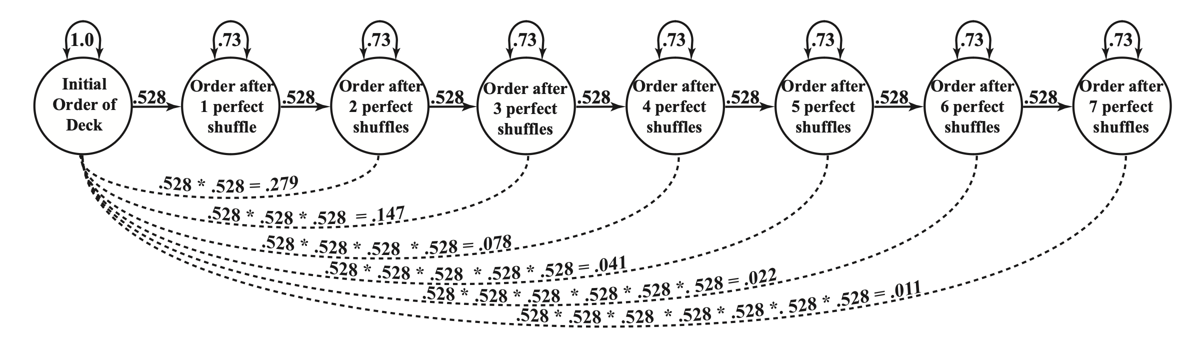 Per comprendere il cambiamento costante e la struttura simplex, si può immaginare un mazzo di carte e una macchina che le mescola perfettamente, tagliando il mazzo esattamente a metà e intercalando le carte una sull’altra. Se si codifica la “posizione” di ogni carta nel mazzo prima della mescolata e poi si correla questa posizione con la posizione ordinata delle carte nel mazzo dopo la mescolata, la correlazione sarebbe di .528. Con una nuova mescolata perfetta, la correlazione tra l’ordine nel secondo e nel terzo mazzo sarebbe ancora di .528. La correlazione tra l’ordine delle carte nel primo e nel terzo mazzo, tuttavia, sarebbe ora di .279, perché sono avvenute due mescolate. Con tre mescolate perfette, la correlazione tra il primo e il quarto mazzo sarebbe ora di .147. Interessante notare che, con questa stabilità di mescolamento, occorrono circa sette mescolate per ritornare a un ordine essenzialmente casuale nel mazzo di carte, dove la correlazione è statisticamente 0.