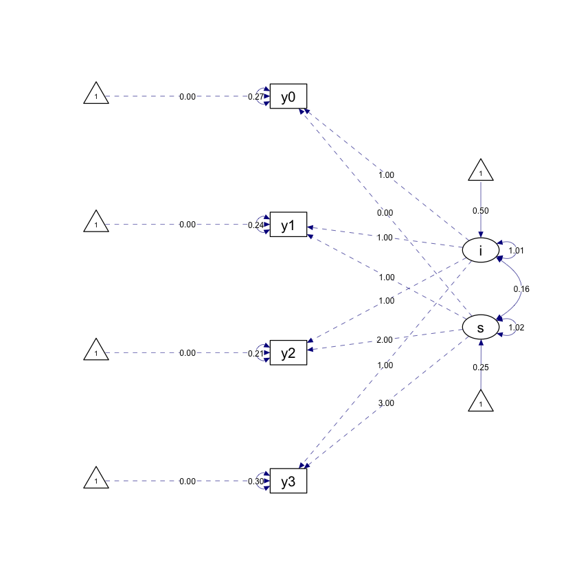 Se però vincoliamo le varianze ad essere uguali per ciascuna rilevazione temporale nel modello LGM, i due modelli producono delle stime identiche. La sintassi seguente viene utilizzata per forzare l’uguaglianza delle varianze in ciascuna rilevazione temporale.