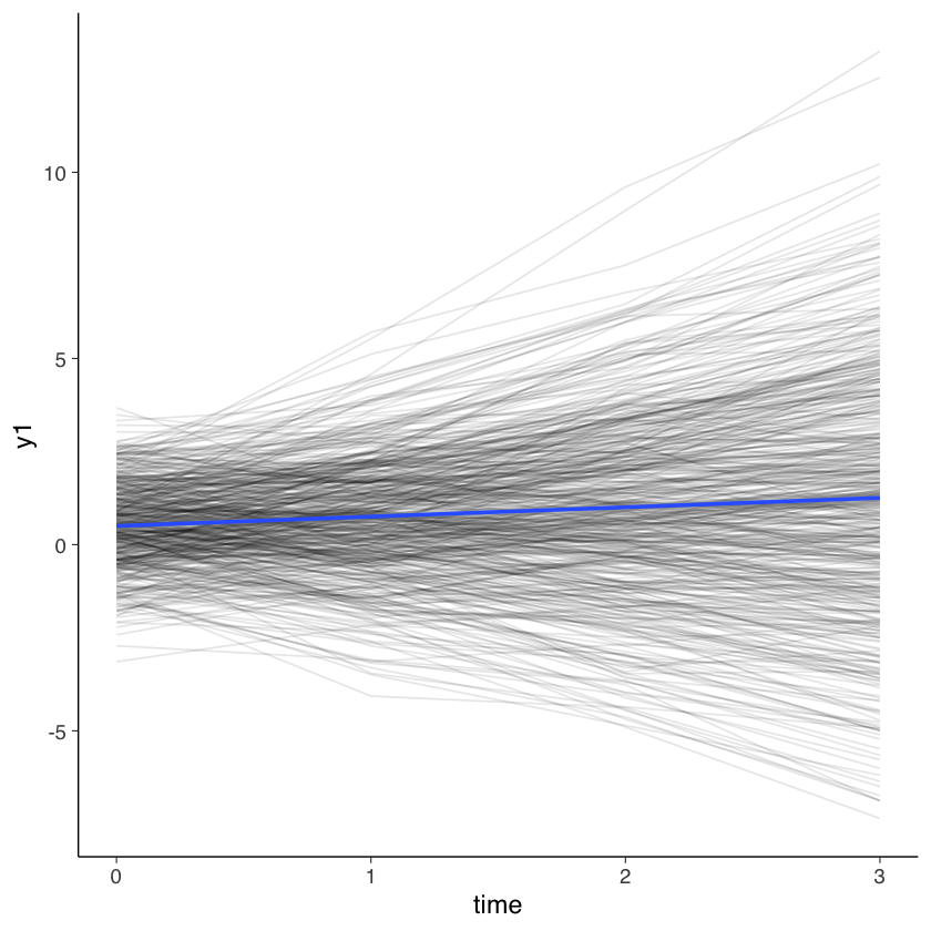 Esaminiamo con una simulazione una dimostrazione del funzionamento dei modelli misti. Ciò ci permetterà di meglio comprendere i modelli a crescita latente. Simuleremo dei dati bilanciati, con punteggi su quattro rilevazioni temporali per 500 individui (soggetti). Esamineremo il tasso di crescita (‘growth’) e consentiremo la presenza di intercette e pendenze specifiche per i diversi soggetti.