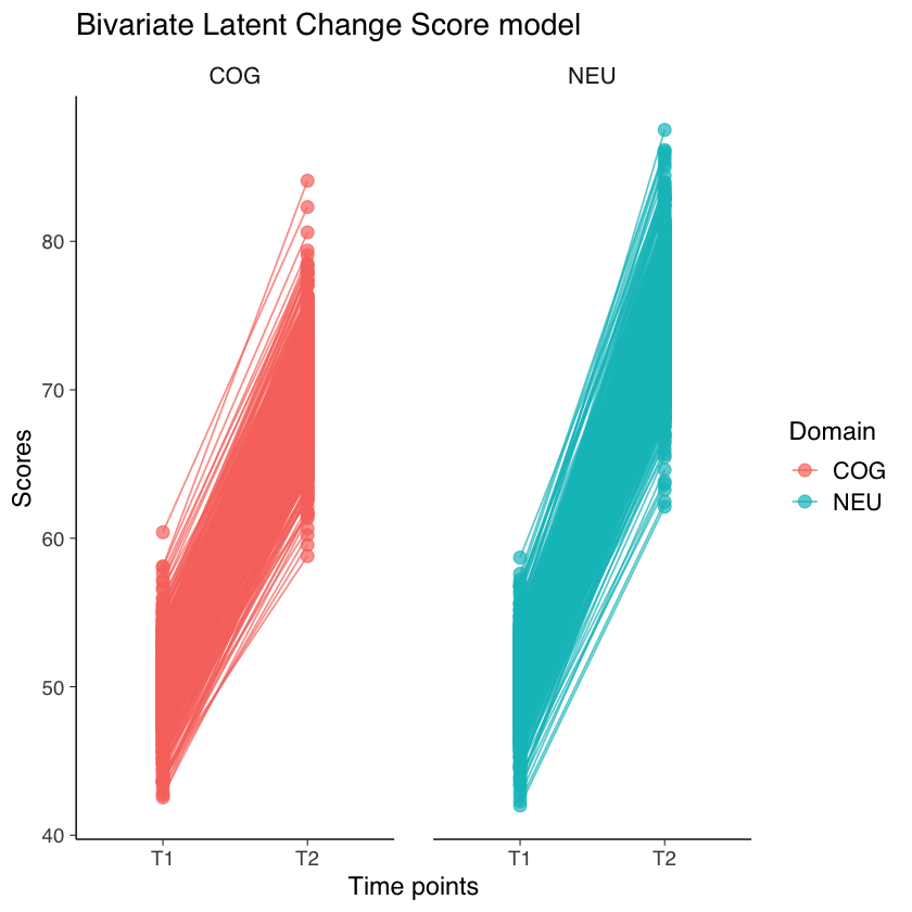 plotdattemp <- data.frame(c(simdatBLCS$COG_T1, simdatBLCS$NEU_T1), c(simdatBLCS$COG_T2, simdatBLCS$NEU_T2), as.factor(c(id, id)), c(rep("COG", times = samplesize), rep("NEU", times = samplesize)))