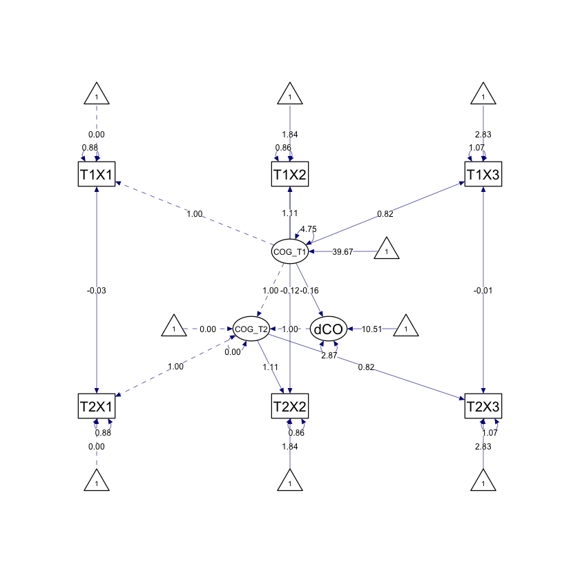 In questo contesto, all’interno dei modelli SEM, si introduce un fattore latente \(\Delta COG1\), che rappresenta il cambiamento tra il tempo 1 e il tempo 2. Questo fattore latente è identificato al tempo 2 con un carico fattoriale fissato a 1, catturando così il cambiamento osservato.