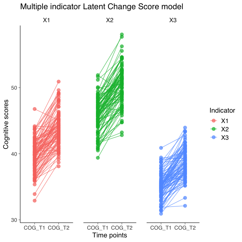In sintesi, il modello LCS fornisce un quadro robusto per analizzare i cambiamenti nel tempo in un costrutto latente, offrendo sia una stima del cambiamento medio sia una misura della varianza individuale in questo cambiamento, e valutando l’effetto dei punteggi iniziali sul cambiamento stesso.