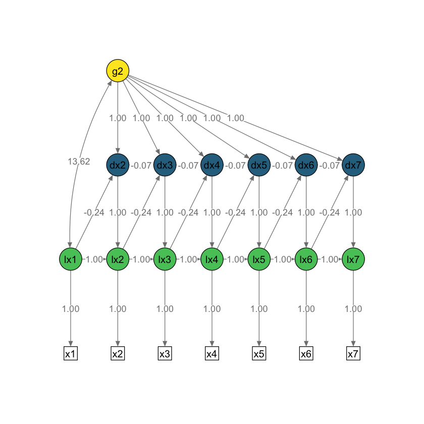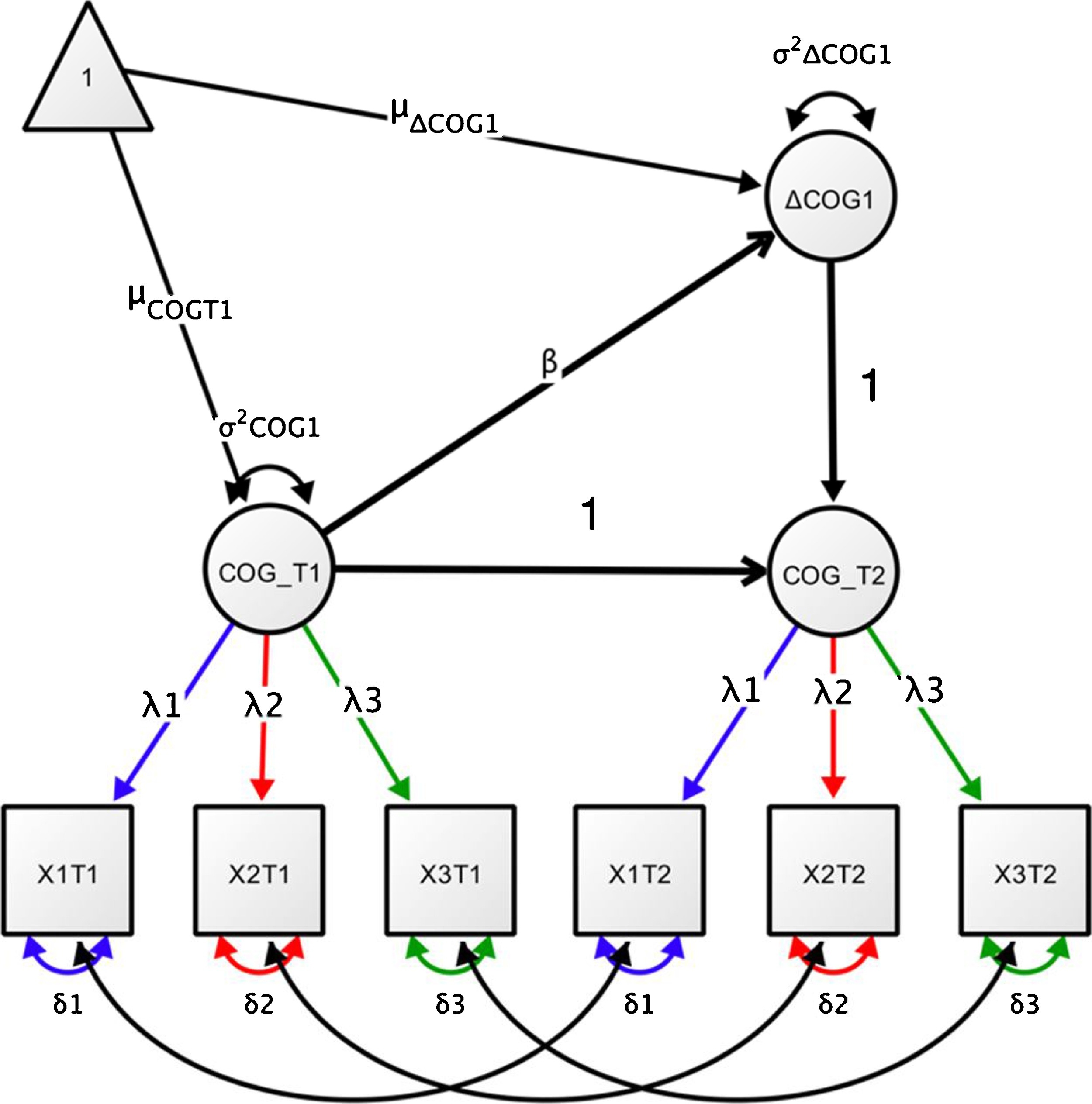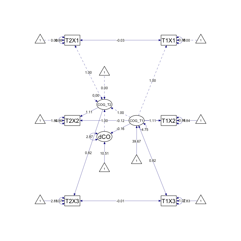 In questo contesto, all’interno dei modelli SEM, si introduce un fattore latente \(\Delta COG1\), che rappresenta il cambiamento tra il tempo 1 e il tempo 2. Questo fattore latente è identificato al tempo 2 con un carico fattoriale fissato a 1, catturando così il cambiamento osservato.