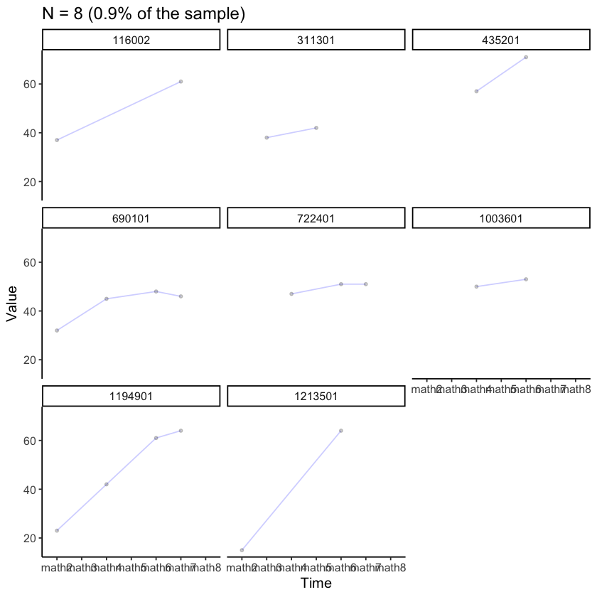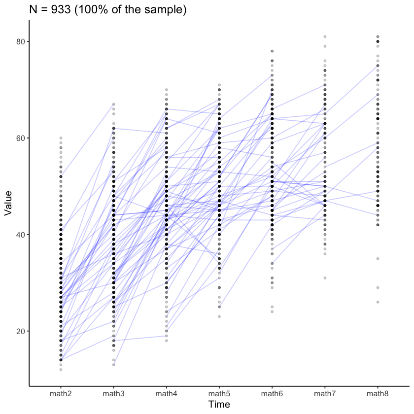 La covarianza tra il punteggio vero iniziale e la componente di cambiamento costante era 13.62, indicando che i bambini con punteggi veri di matematica più alti al grado 2 tendevano ad avere punteggi nella componente di cambiamento costante più elevati, il che rivela un cambiamento complessivo maggiore dal secondo all’ottavo grado.
