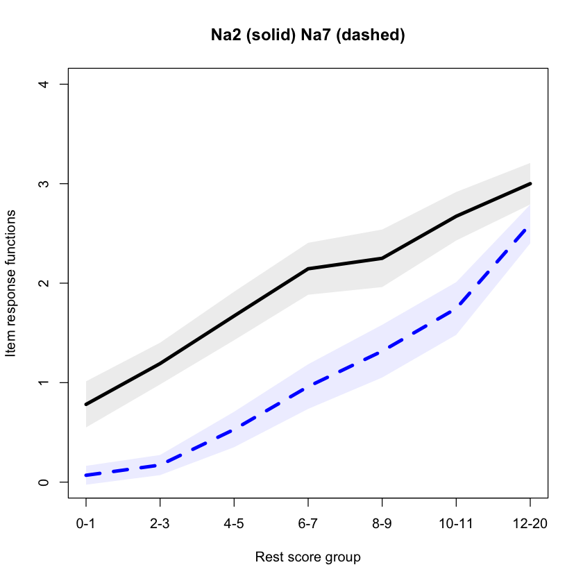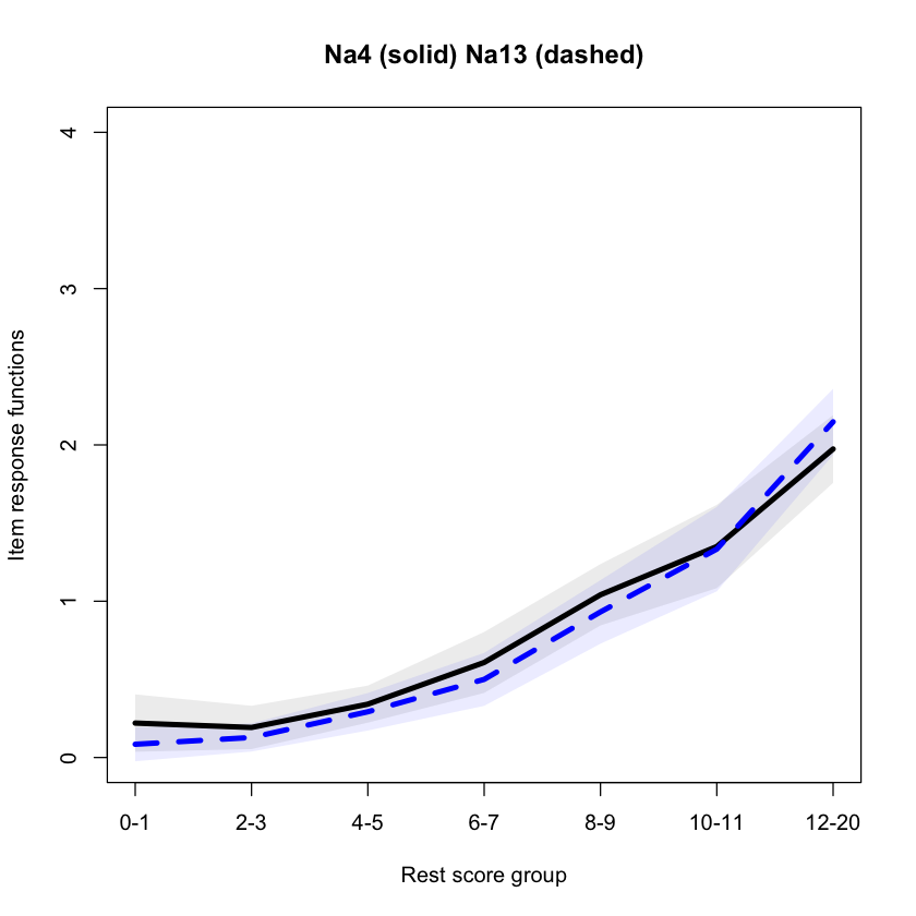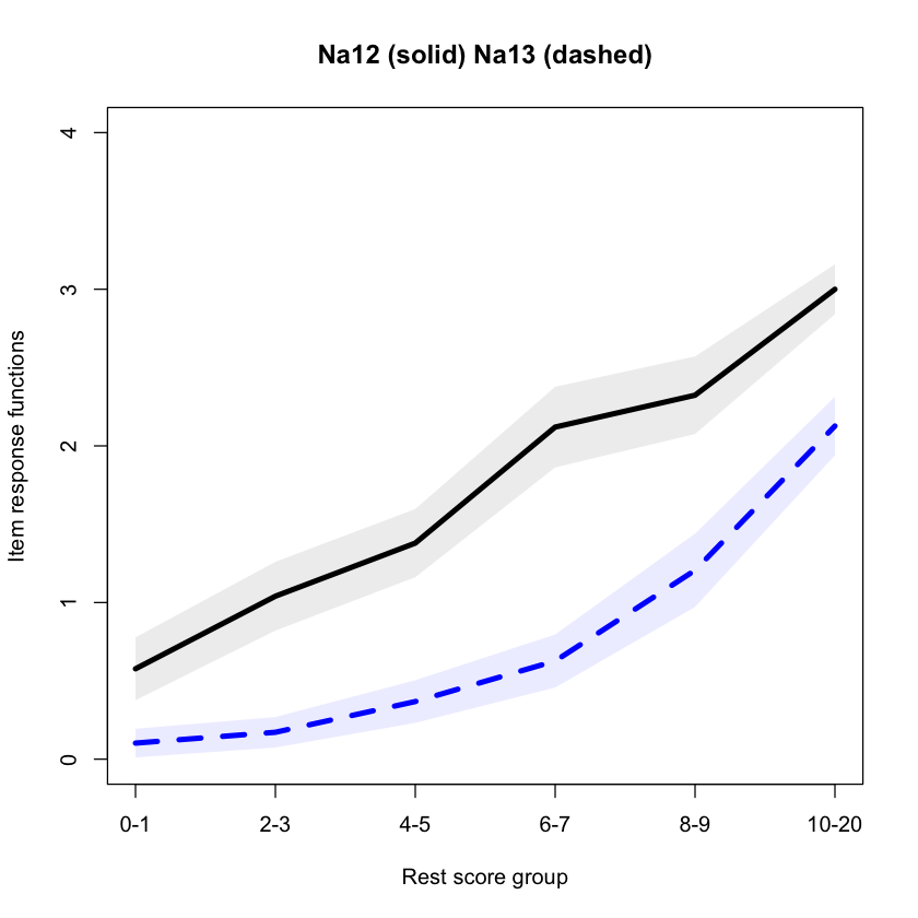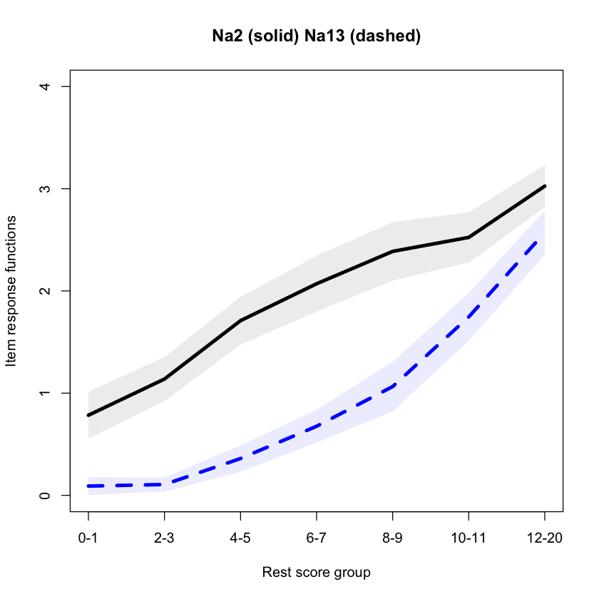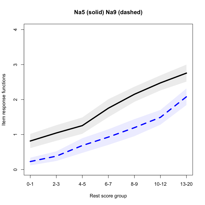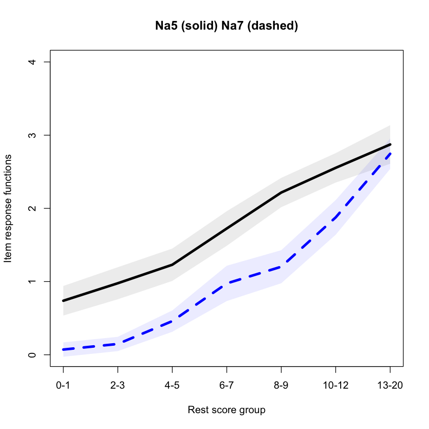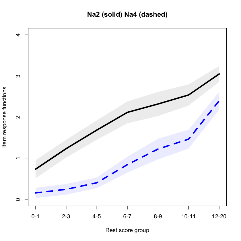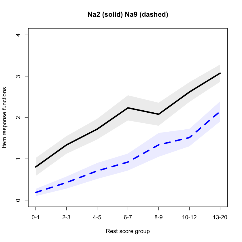 Per uomini e donne separatamente, si possono calcolare i percentili di rango per NA, SI e DS14. In una figura, Sijtsma and van der Ark [SvdA17] mostrano che per NA e DS14, lo stesso punteggio al test porta a un percentile di rango più elevato per gli uomini rispetto alle donne. Tuttavia, per DS14 gli intervalli di confidenza sovrapposti suggeriscono che la maggior parte delle differenze di punteggio tra uomini e donne non sono marcate. Per quanto riguarda SI, le donne hanno punteggi percentile costantemente più alti, ma le differenze sono piccole. Dato il minor numero di osservazioni, gli intervalli di confidenza delle donne sono più ampi.