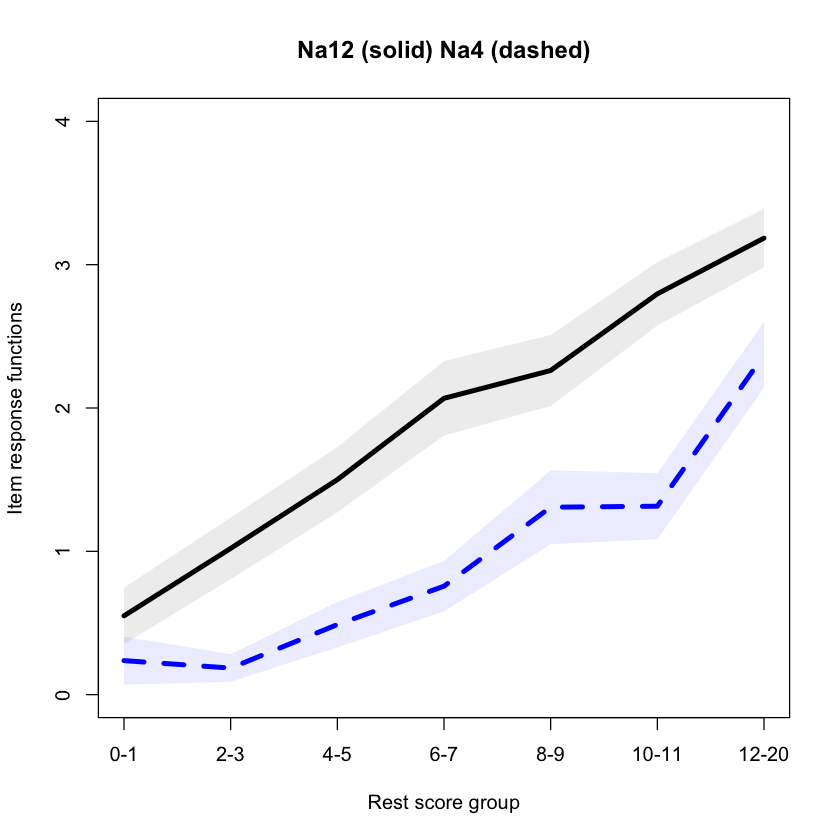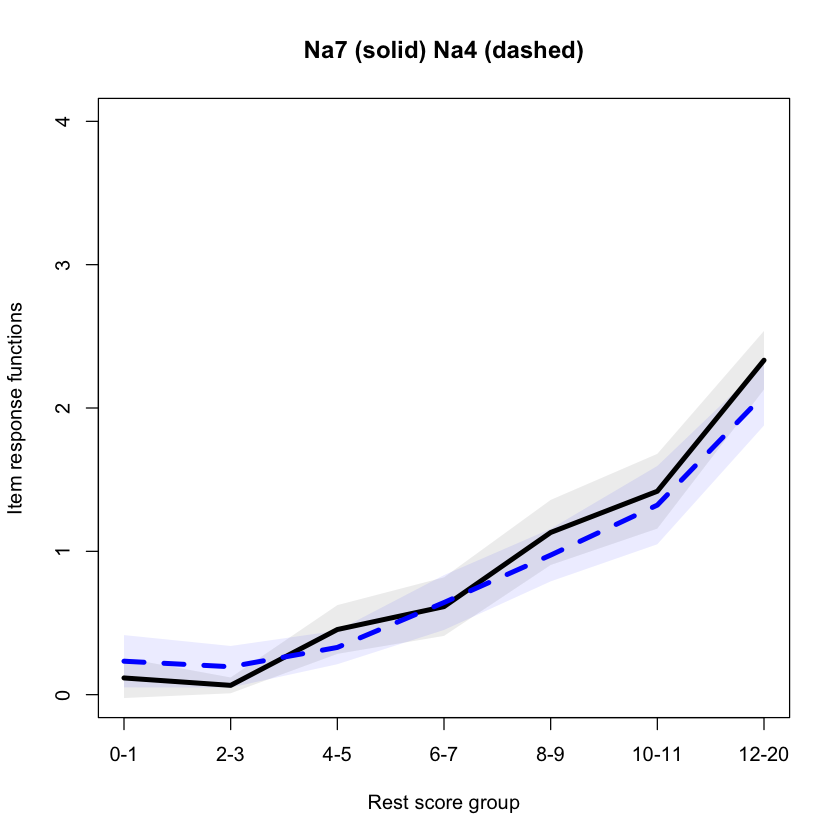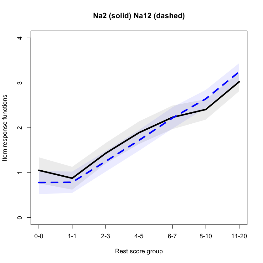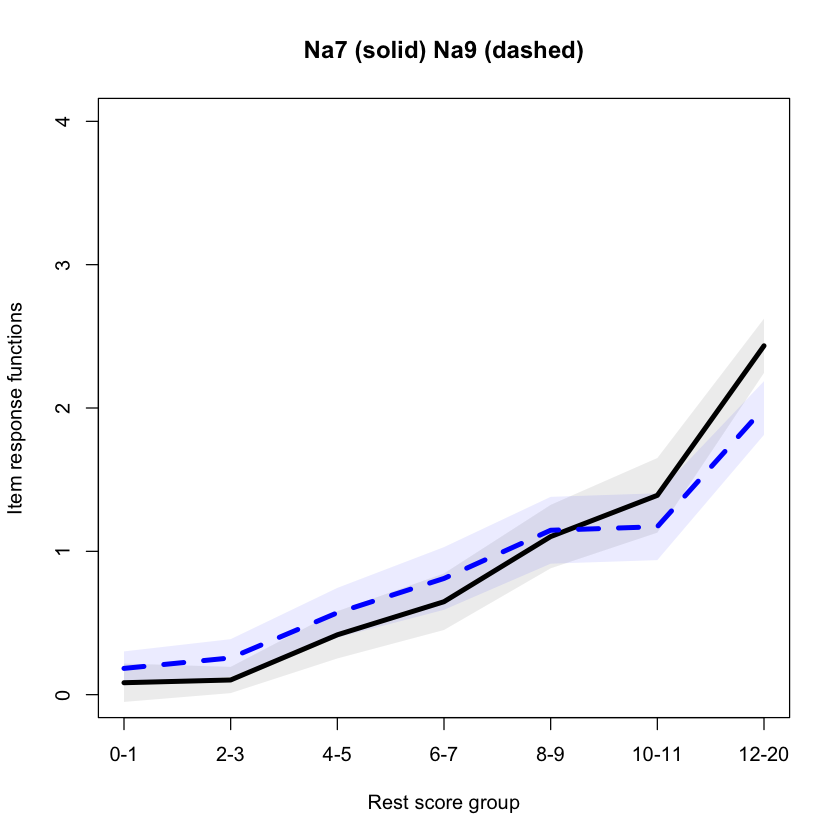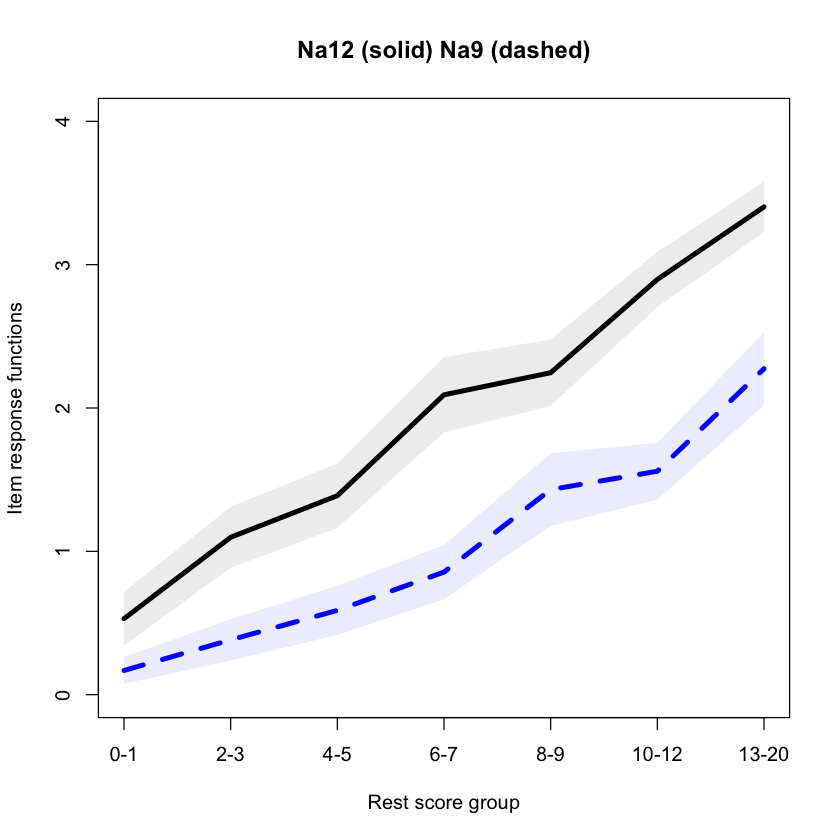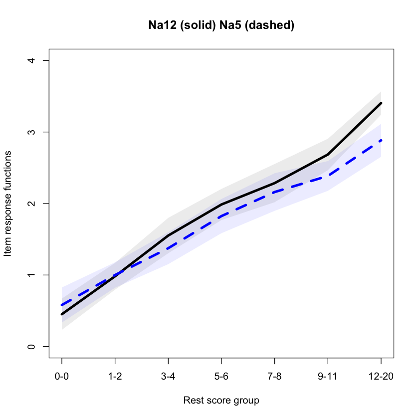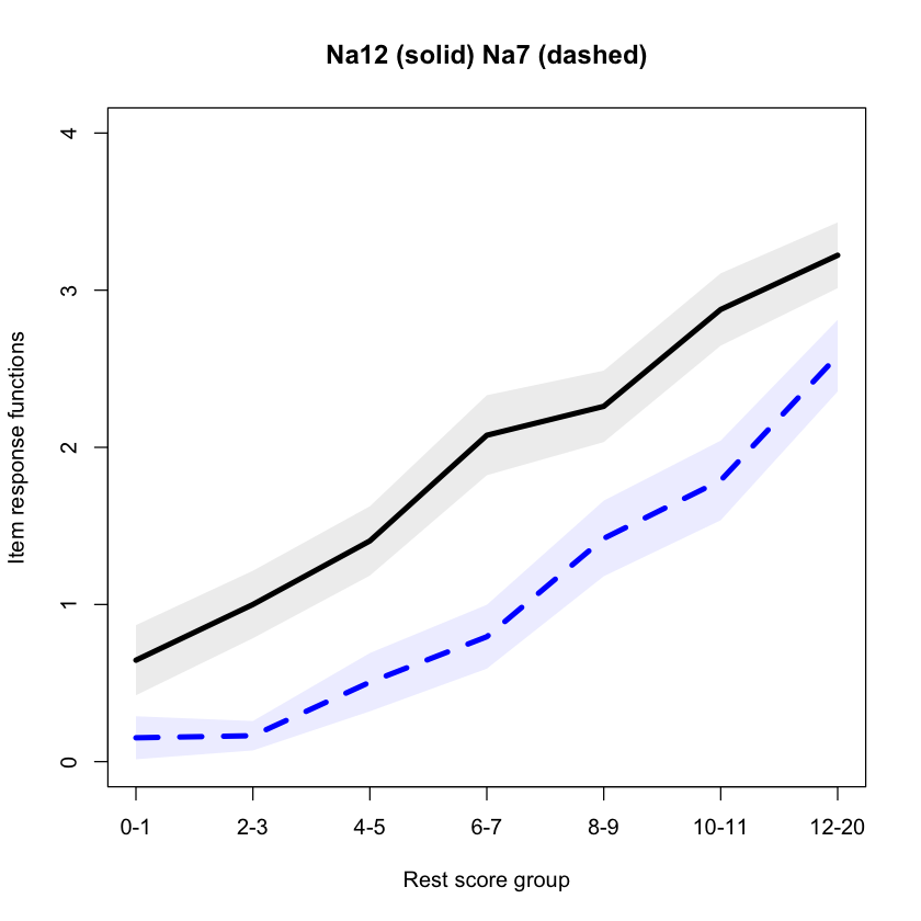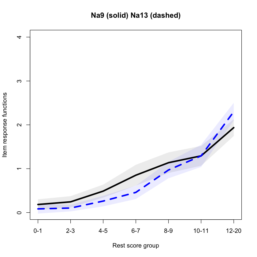 Per uomini e donne separatamente, si possono calcolare i percentili di rango per NA, SI e DS14. In una figura, Sijtsma and van der Ark [SvdA17] mostrano che per NA e DS14, lo stesso punteggio al test porta a un percentile di rango più elevato per gli uomini rispetto alle donne. Tuttavia, per DS14 gli intervalli di confidenza sovrapposti suggeriscono che la maggior parte delle differenze di punteggio tra uomini e donne non sono marcate. Per quanto riguarda SI, le donne hanno punteggi percentile costantemente più alti, ma le differenze sono piccole. Dato il minor numero di osservazioni, gli intervalli di confidenza delle donne sono più ampi.