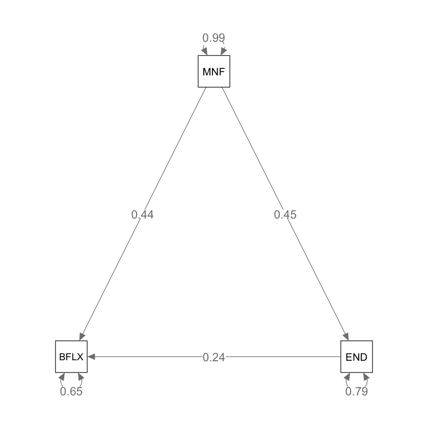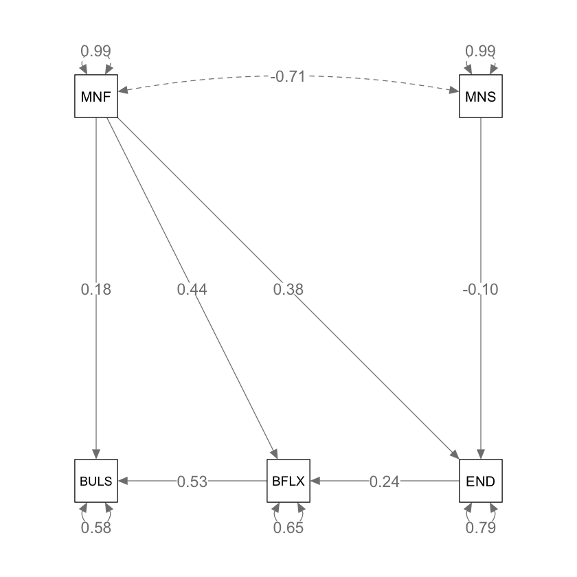 Anche in questo caso i coefficienti di percorso sono simili, ma non identici, a quelli riportati da Barbeau et al. (2019). Gli autori riportano una varianza spiegata di END pari a 0.209; con lavaan si ottiene 0.208. Per BFLX gli autori riportano 0.292; lavaan ottiene 0.349. Per BULS gli autori riportano 0.478; con lavaan si ottiene 0.419.