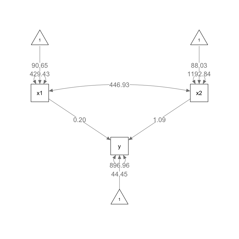 La figura Fig. 25.2 mostra la relazione tra due variabili osservabili. L’effetto totale presunto di X su Y è illustrato tramite un percorso diretto, rappresentando l’effetto causale lineare di X su Y. La varianza di X, una variabile esogena, è un parametro libero e viene rappresentata nella figura con il simbolo RAM che indica una varianza (indicata da una freccia curva bidirezionale). Al contrario, la varianza di Y, una variabile endogena, non è libera di variare; invece, è associata a una variabile latente D, il termine di disturbo o errore, che rappresenta la variazione in Y non spiegata da X.