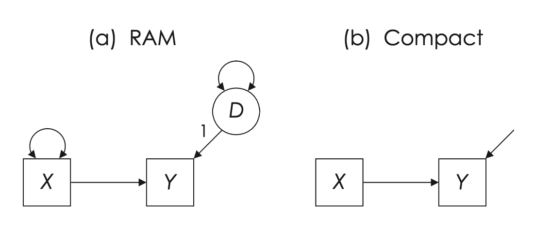 La rappresentazione nella Fig. 25.2b fornisce le stesse informazioni in modo più sintetico. Alternativamente, nella Fig. 25.2a si potrebbe rappresentare la varianza residua di Y con una freccia curva bidirezionale, al posto di utilizzare il termine di disturbo D identificato dal vincolo di identificazione del carico unitario. Il valore numerico associato a questa freccia curva bidirezionale sarebbe lo stesso di quello che si ottiene con la rappresentazione della variabile latente di disturbo: \(1 \times var_D \times 1\).
