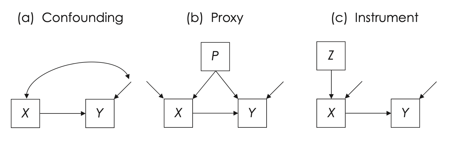 Nel contesto dei modelli statistici, è possibile affrontare il problema dei confonditori non misurati in due modi principali: attraverso la selezione di covariate appropriate o utilizzando i metodi delle variabili strumentali. Per illustrare, la Fig. 25.3 (b) propone l’uso di un proxy (P) che funge da sostituto per un confonditore non misurato che influisce su entrambe le variabili X e Y. In questo contesto, la variabile X è considerata endogena, il che significa che è influenzata dal proxy P (che a sua volta influisce anche su Y), indicando una possibile relazione di causa-effetto tra P e X.