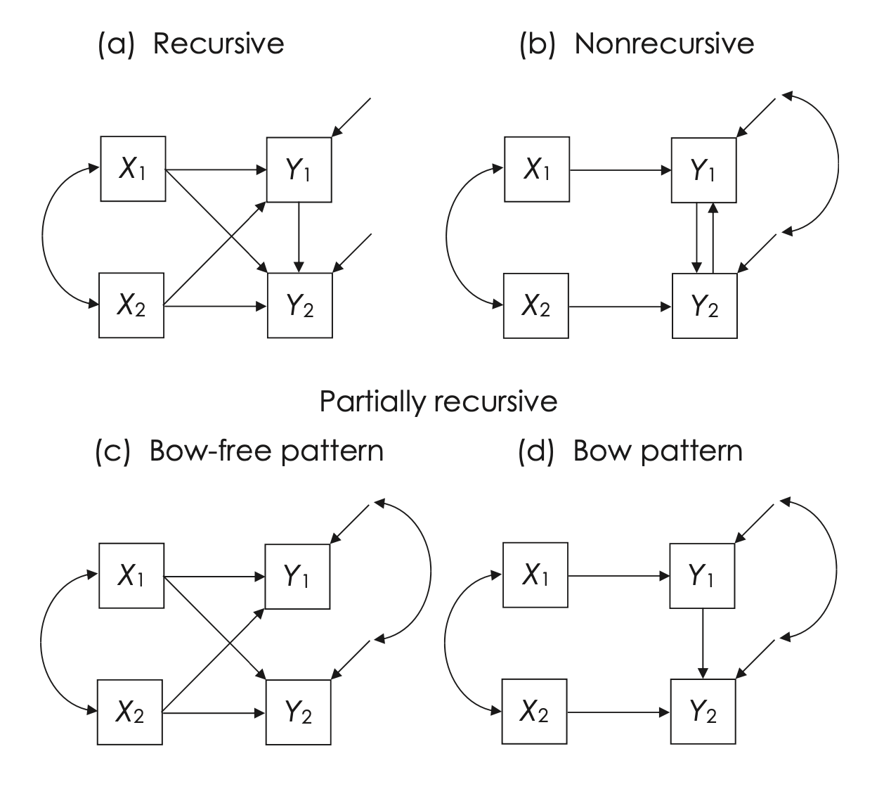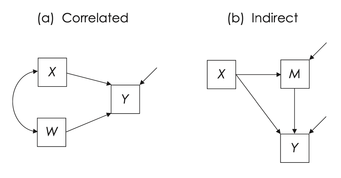 Nel pannello (a) della Fig. 25.2, il percorso da D a Y rappresenta l’effetto diretto di tutte queste cause omesse, oltre agli errori, sulla variabile endogena Y. In sostanza, questo percorso simboleggia l’insieme di tutte le influenze non incluse nel modello che possono impattare su Y. È importante notare che, mentre queste fonti di varianza del disturbo possono essere teoricamente distinte, nella pratica possono sovrapporsi e interagire tra loro.