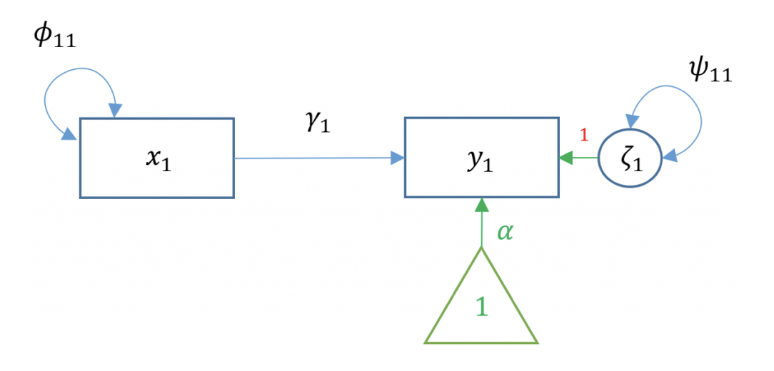 direttamente istruisce il software a regredire la variabile Y su X e a gestire automaticamente il termine di disturbo, come rappresentato nel pannello (a) della Fig. 25.2. Questo comando, oltre a definire l’effetto di X su Y, stabilisce anche che le varianze di X e il termine di disturbo di Y sono parametri liberi da stimare.