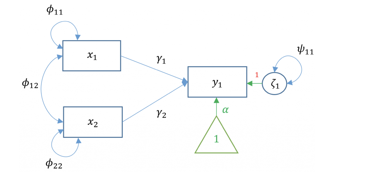 Il numero (1) vicino al percorso nella Fig. 25.2a è una costante di scala che assegna una metrica al termine di disturbo. Questa specificazione è essenziale perché la varianza del termine di disturbo è latente e le variabili latenti richiedono che un fattore di scala sia fissato per la loro stima. Questa costante di scala è nota anche come il vincolo di identificazione del carico unitario (unit loading identification constraint, ULI). Il valore “1” comunica al software di suddividere la varianza totale (osservata) di Y in due componenti distinte (ortogonali): la varianza spiegata da X e la varianza non spiegata (o varianza del disturbo, \(var_D\)).