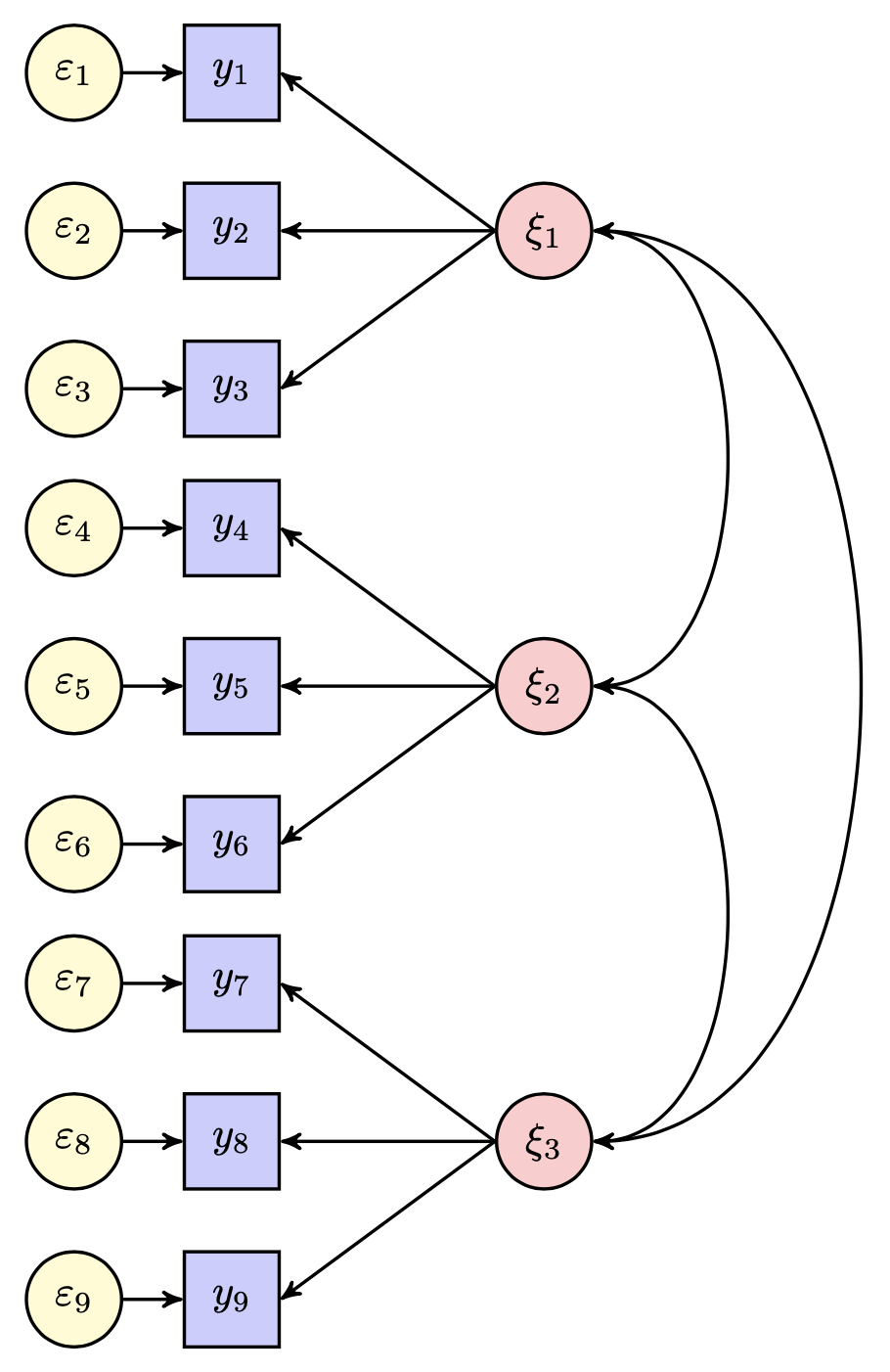 L’assenza di una freccia tra due variabili nel diagramma suggerisce l’assenza di correlazione tra di esse. Nel caso della Fig. 52.1, si illustrano le relazioni tra nove variabili osservate e tre variabili latenti mediante il path diagram.
