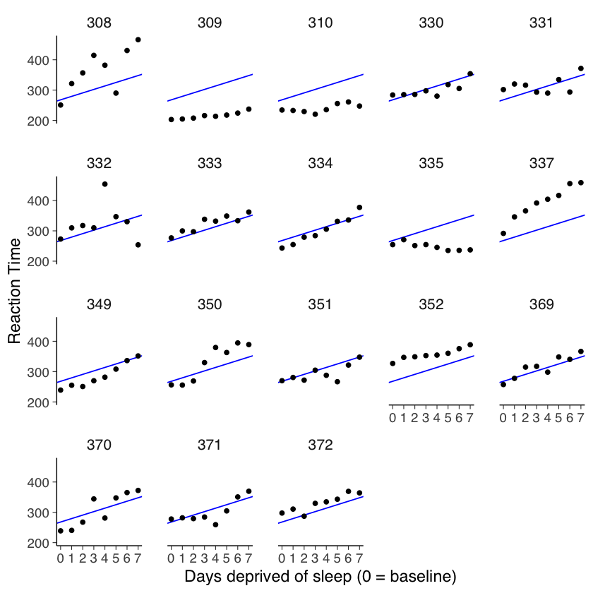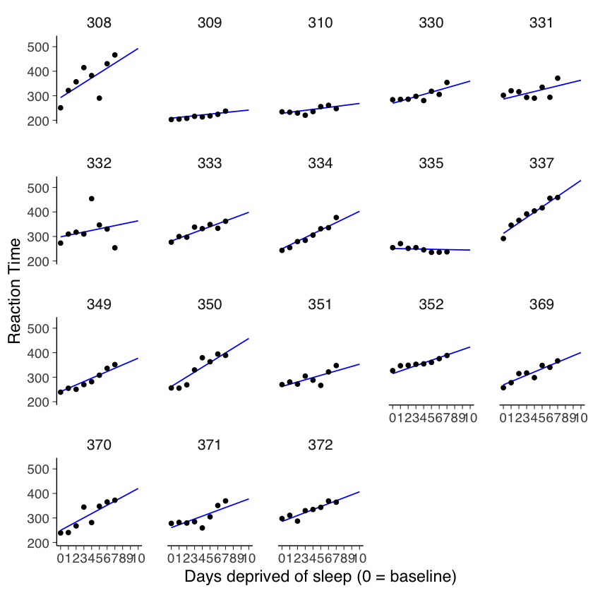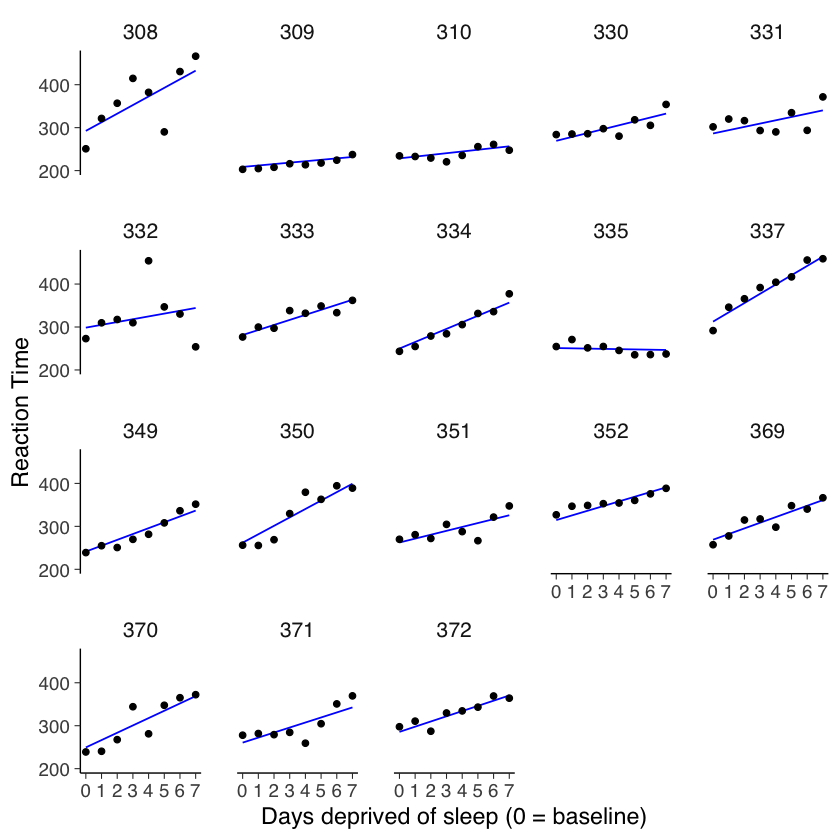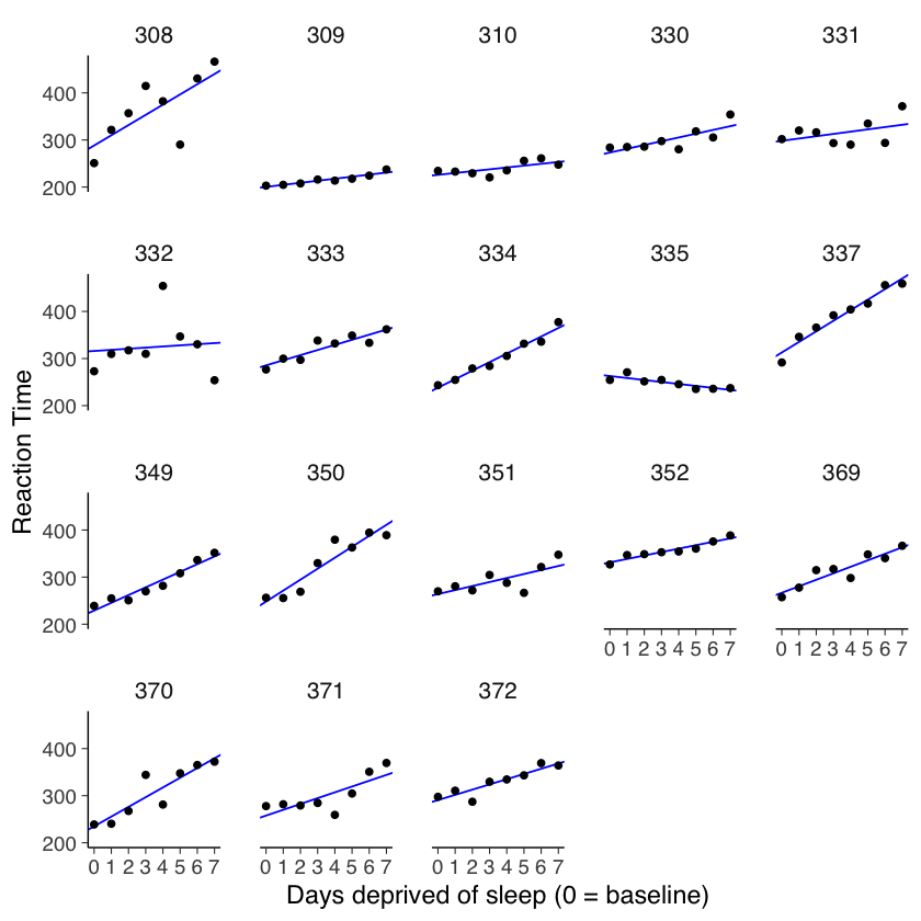 Nel contesto dello studio sulla privazione del sonno, l’analisi dei dati suggerisce che, a parte una singola eccezione (il soggetto 335), il tempo di reazione medio tende ad aumentare progressivamente con ogni giorno aggiuntivo di privazione del sonno. Questo pattern indica che potrebbe essere utile descrivere le prestazioni di ciascun partecipante attraverso un modello di regressione lineare.