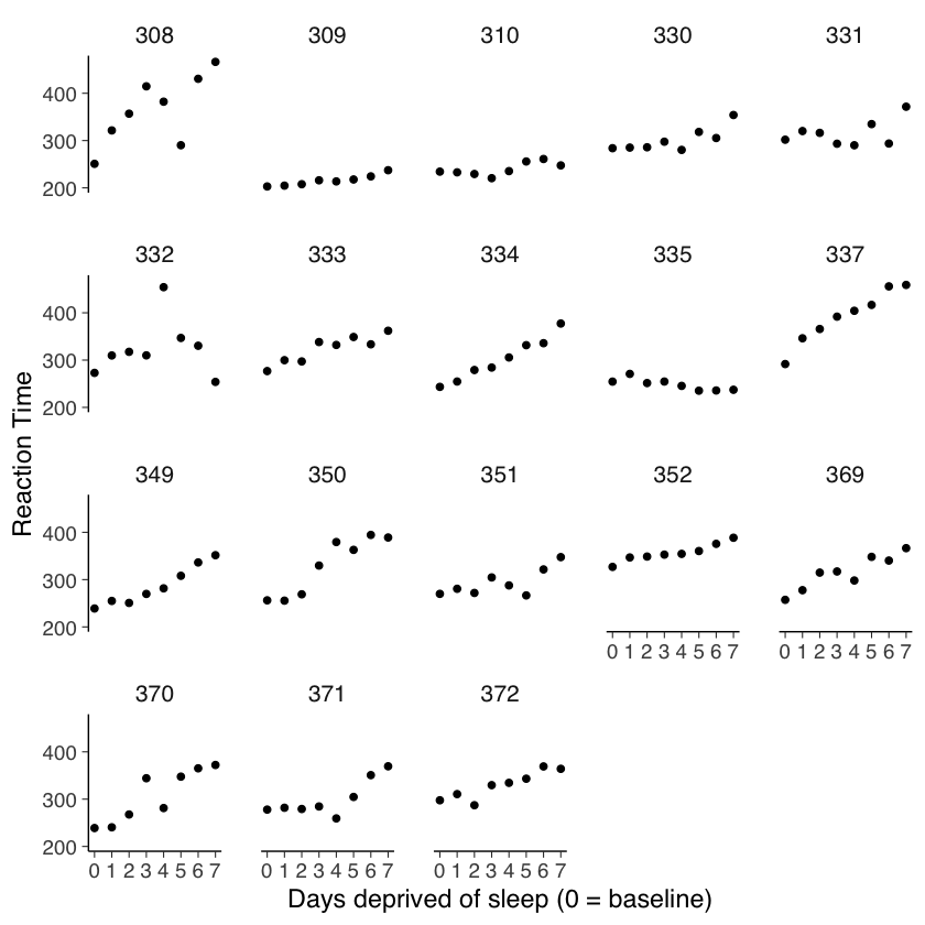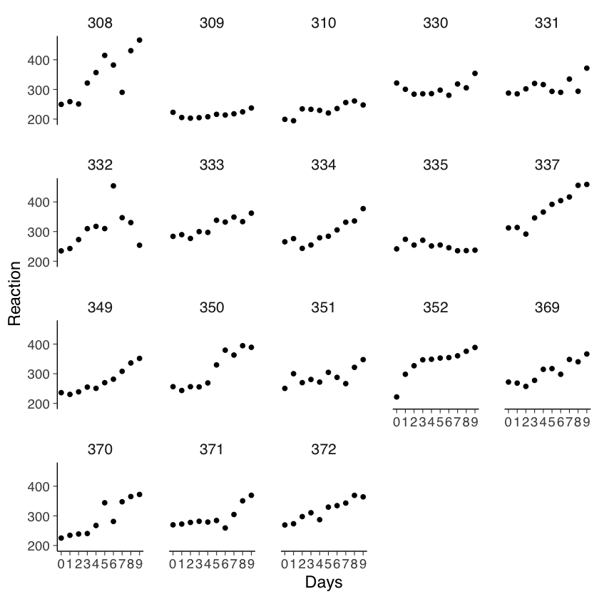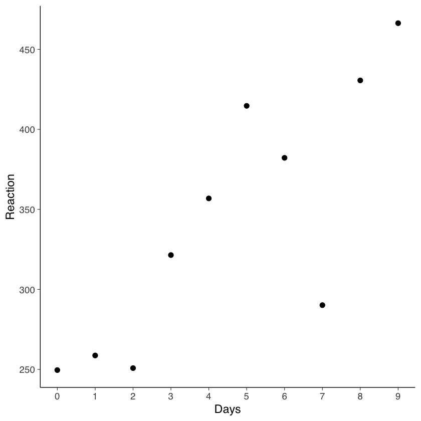 ggplot(sleepstudy, aes(x = Days, y = Reaction)) +