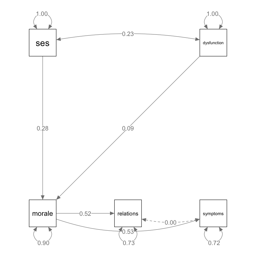 Nel modello che stiamo analizzando, l’indice di modifica (MI) più elevato si riferisce alla possibile modifica del parametro che governa la correlazione tra i residui degli indicatori mm1 e mm2. Nel modello model_mdd questa correlazione residua è impostata a zero, indicando l’assenza di una correlazione diretta tra questi residui. Tuttavia, l’indice di modifica suggerisce che se permettessimo a questa correlazione di essere stimata liberamente dal modello (anziché tenerla fissa a zero), si verificherebbe un miglioramento dell’adattamento del modello ai dati osservati. Questa osservazione è in linea con il modello alternativo che è stato proposto per questi dati proposto da Brown [Bro15].