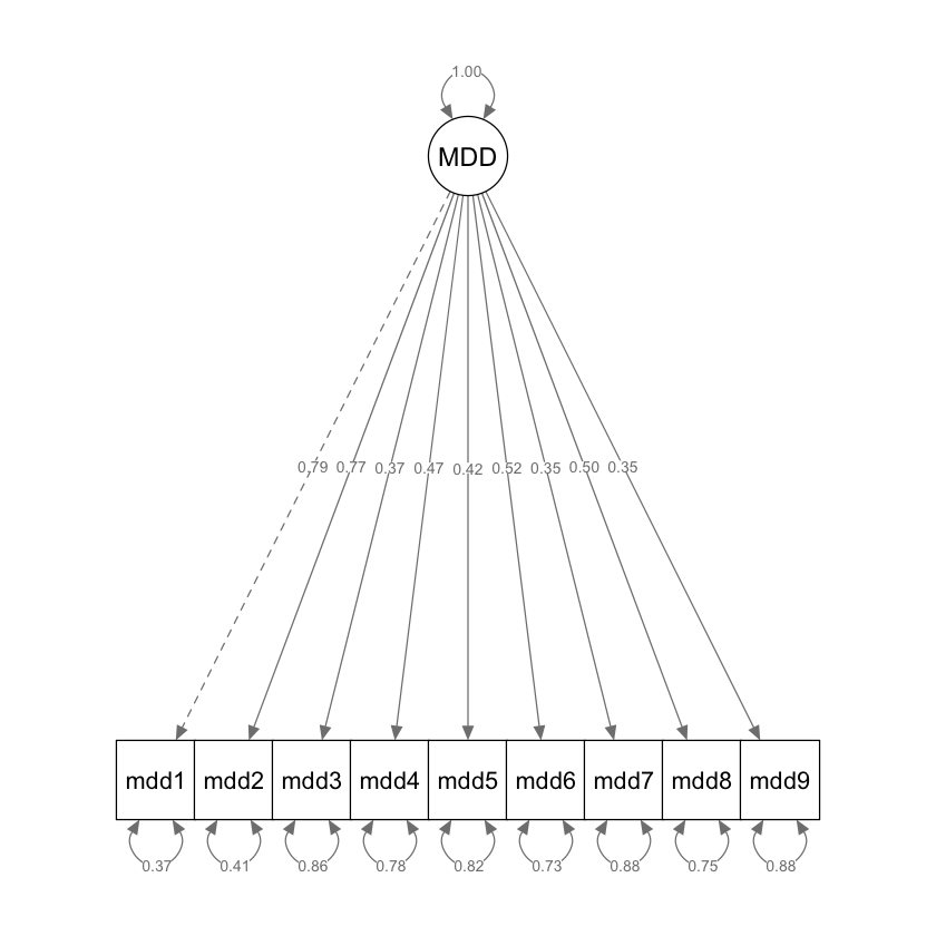 MDD =~ mdd1 + mdd2 + mdd3 + mdd4 + mdd5 + mdd6 + mdd7 + mdd8 + mdd9