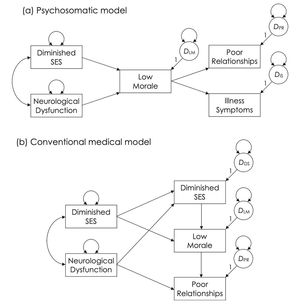 In conclusione, i valori i valori degli indici di adattamento predittivo per i due modelli alternativi di Romney et al. (1992) sono stati generati seguendo le istruzioni precedentemente descritte. Non sorprende che l’adattamento globale del modello medico convenzionale, più complesso (con \( dfM = 3 \)), sia migliore rispetto a quello del modello psicosomatico, più semplice (con \( dfM = 5 \)). Nonostante il modello medico convenzionale sia più complesso e quindi soggetto a una penalità maggiore per il minor numero di gradi di libertà, i valori ottenuti sia nell’AIC che nel BIC sono inferiori rispetto a quelli del modello psicosomatico. Questo indica che il vantaggio in termini di adattamento del modello medico convenzionale è sufficiente a superare la penalità per la sua maggiore complessità. In base a queste analisi, il modello medico convenzionale è considerato più adatto rispetto al modello psicosomatico, come evidenziato dai valori più bassi nei criteri AIC e BIC.