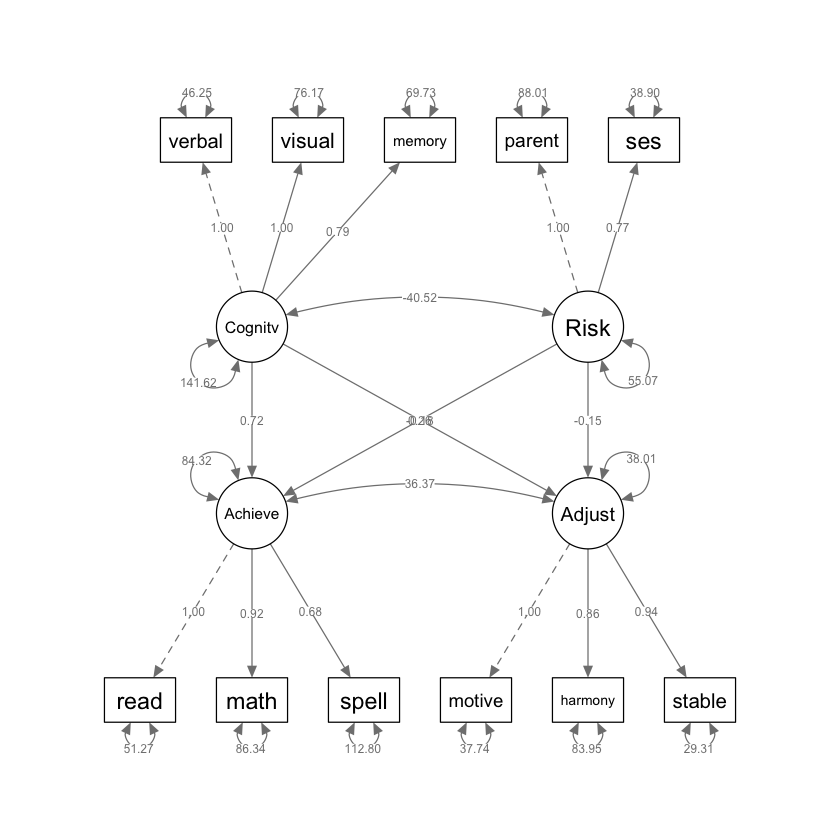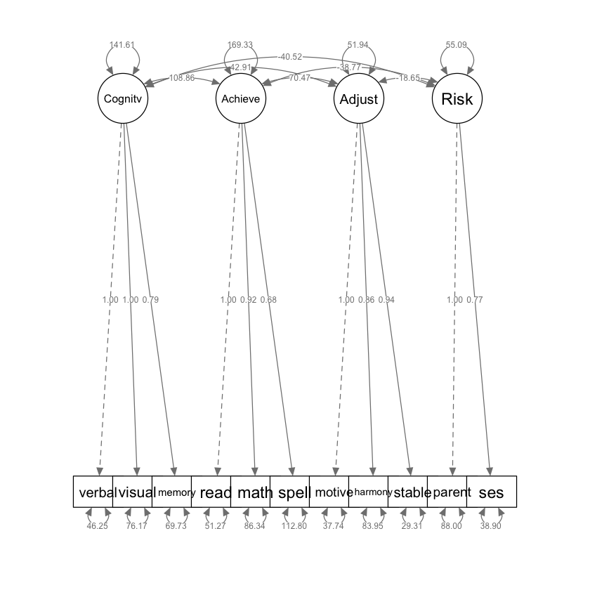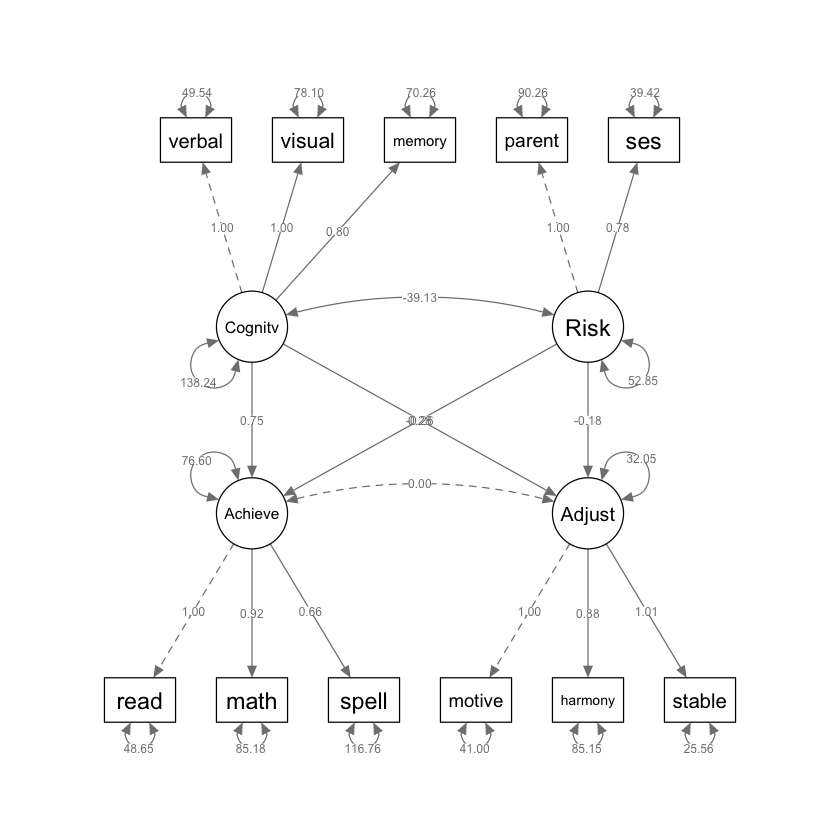 La presenza di questa correlazione parziale sostanziale implica che ci sono fattori non misurati nel modello che influenzano sia il rendimento scolastico sia l’adattamento in classe. Questi fattori non misurati potrebbero includere variabili come il sostegno familiare, la qualità dell’insegnamento, fattori ambientali o personalità dello studente. Importante è che questi fattori non misurati sono distinti sia dall’abilità cognitiva dello studente sia dal suo rischio di psicopatologia. In conclusione, il valore di .643 non solo mette in luce l’interdipendenza tra rendimento scolastico e adattamento in classe, ma suggerisce anche l’esistenza di altre variabili influenti che non sono state direttamente misurate o incluse nel modello. Questa informazione può essere preziosa per indirizzare ulteriori ricerche o interventi educativi.