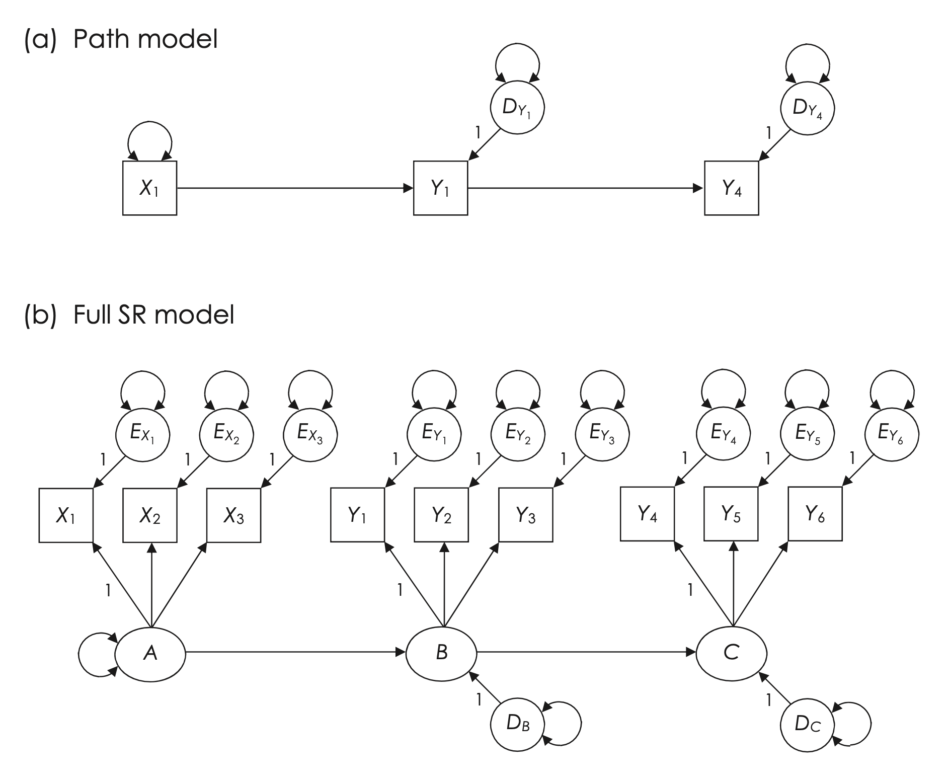 La Figura Fig. 54.1 (b) illustra un modello di Regressione Strutturale (SR) completo, che integra sia componenti strutturali sia di misurazione. In questo modello SR, a differenza del modello di percorso, ciascun indicatore (X1, Y1, Y4) è definito come uno tra numerosi indicatori associati a un fattore comune. Di conseguenza, tutte le variabili osservabili in questa figura includono termini di errore.