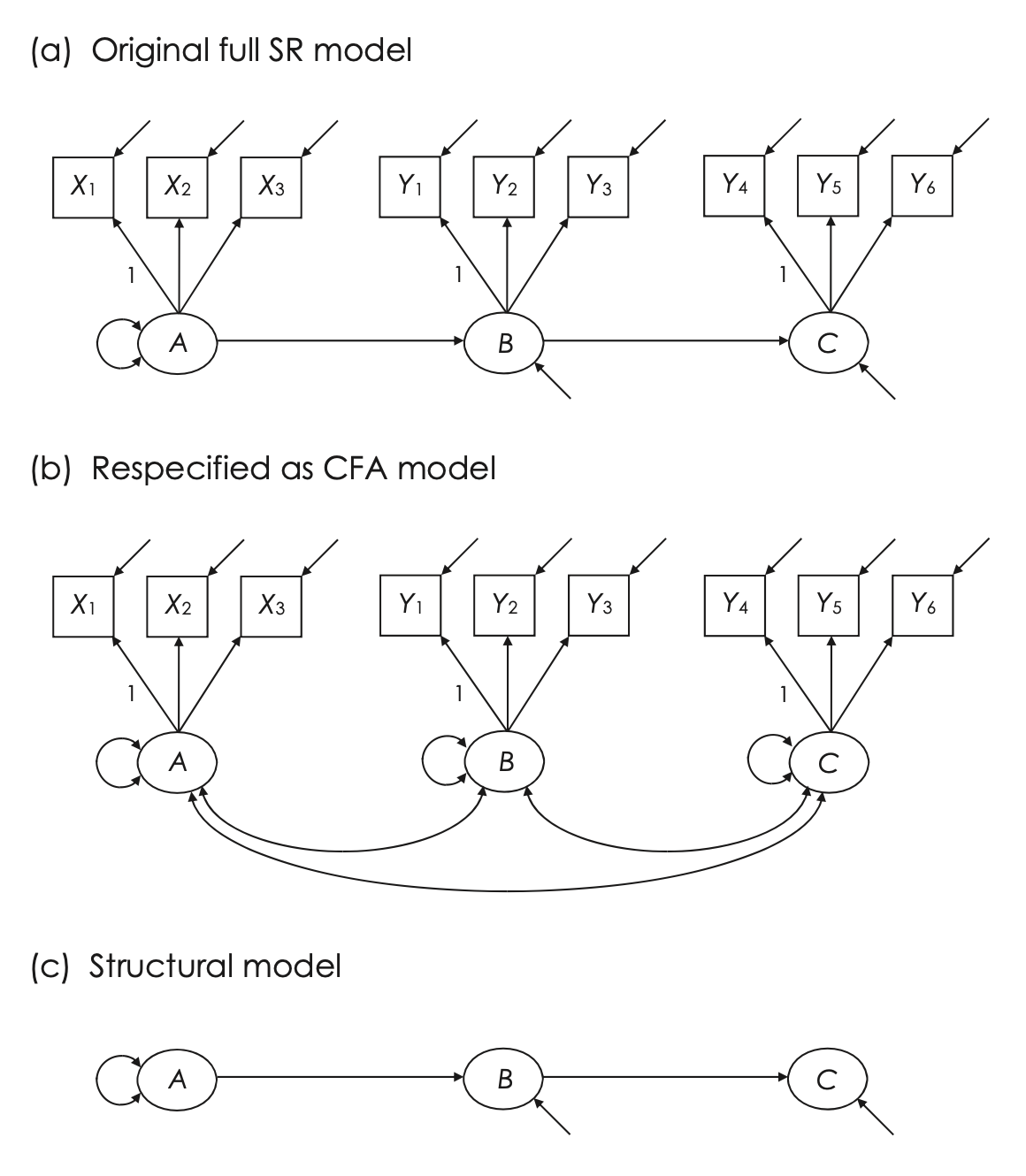 Primo Passaggio: Il modello SR originale viene trasformato in un modello di misurazione CFA. Questo modello riformulato viene quindi analizzato per valutare l’adattamento ai dati. Un cattivo adattamento del modello CFA potrebbe indicare errori nelle ipotesi di misurazione del ricercatore e suggerire che l’adattamento del modello SR originale potrebbe essere compromesso, specialmente se la sua parte strutturale è sovraidentificata.