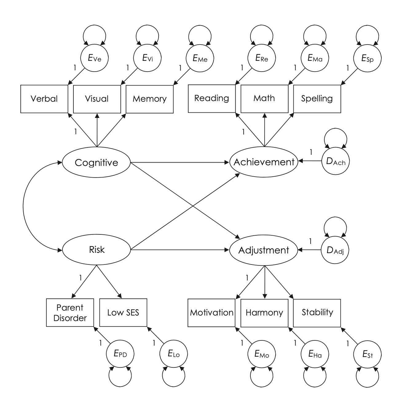 La Fig. 54.3 illustra un modello SR (Regressione Strutturale) iniziale che esplora il rendimento scolastico e l’adattamento in aula di studenti di età media corrispondente ai gradi 7-8. Il modello considera l’influenza dell’abilità cognitiva generale e del livello di rischio di disturbi psicopatologici. Uno degli indicatori di rischio deriva dalla diagnosi di disturbi psichiatrici maggiori nei genitori, mentre il secondo è basato sul livello socio-economico (SES) della famiglia, con punteggi più alti che indicano un SES inferiore. Le abilità cognitive sono valutate tramite i punteggi in ragionamento verbale, analisi visivo-spaziale e memoria, ottenuti da un test di QI somministrato individualmente.