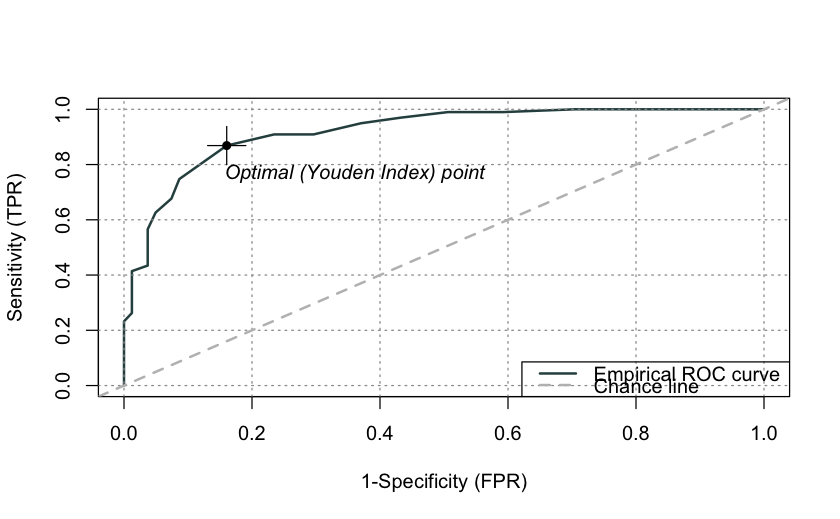 Si noti che si possono ottenere gli stessi risultati trovati sopra usando le funzioni del pacchetto ROCit.