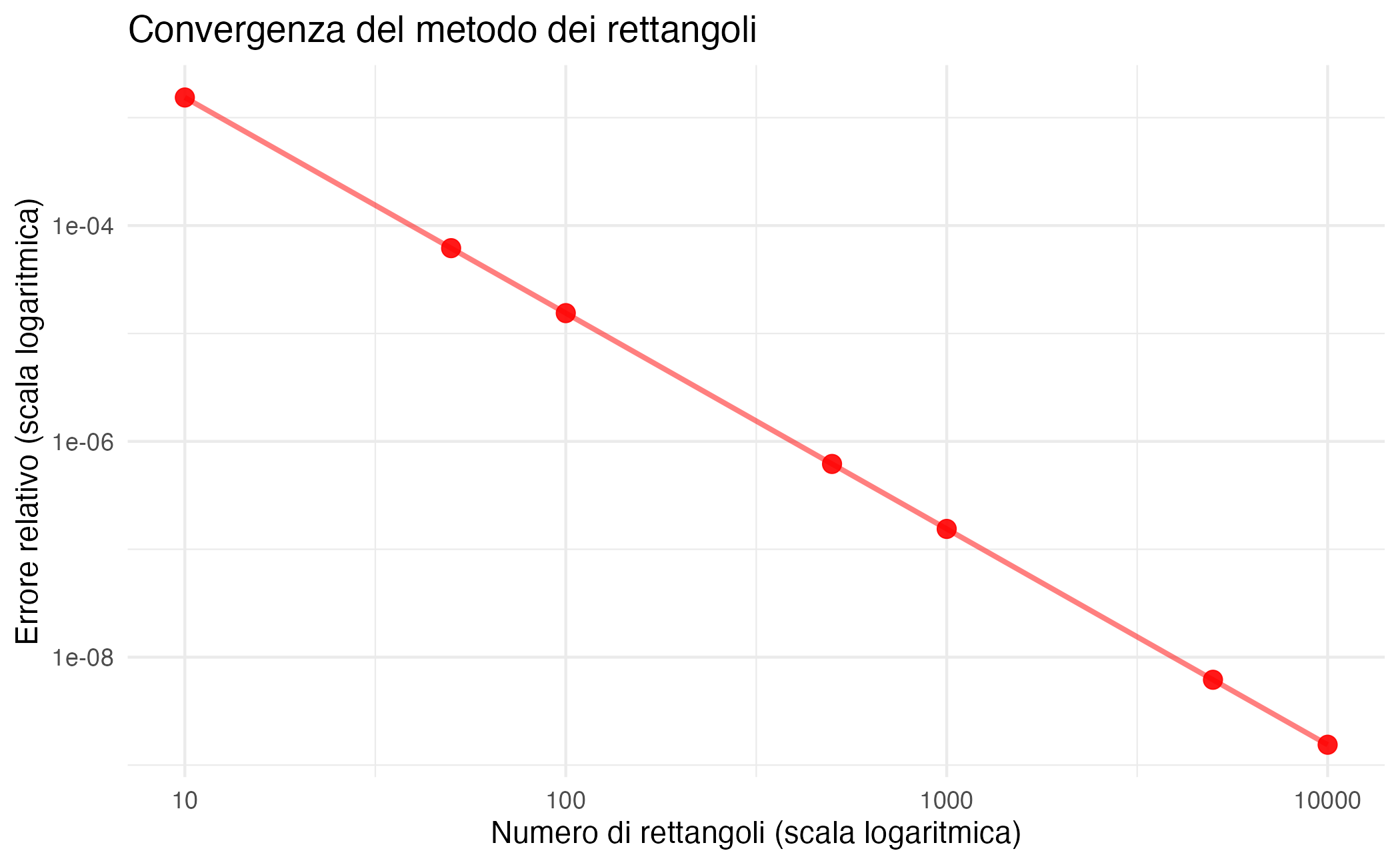 Tuttavia, il metodo presenta anche notevoli limitazioni. La sua velocità di convergenza è relativamente lenta, dell’ordine di \(O(1/n)\), il che significa che per dimezzare l’errore è necessario raddoppiare il numero di rettangoli. Ciò lo rende poco efficiente per le funzioni dal comportamento irregolare o con punti di discontinuità. Per ottenere un’elevata precisione, è necessario un numero considerevole di valutazioni della funzione, il che comporta un aumento del costo computazionale.
