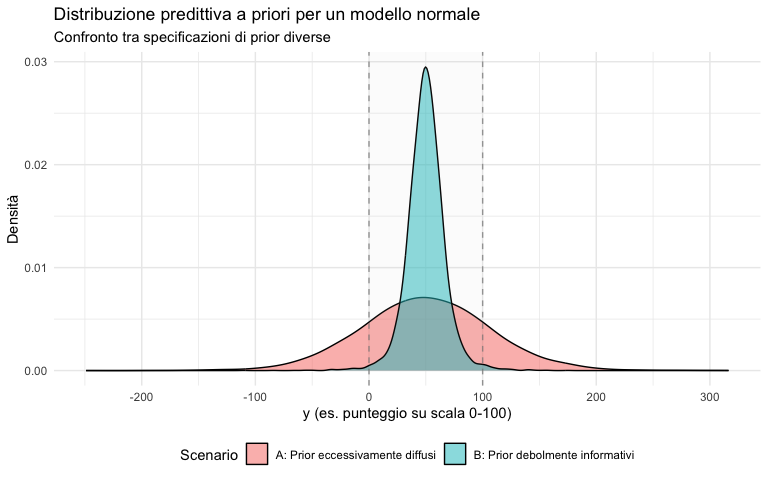 L’obiettivo dei prior non è forzare meccanicamente i dati entro un campo di variazione predefinito, ma esprimere una conoscenza pregressa che, per coerenza logica, non dovrebbe rendere probabili scenari che il ricercatore sa essere impossibili. I controlli predittivi a priori rivelano quando questa coerenza viene violata.