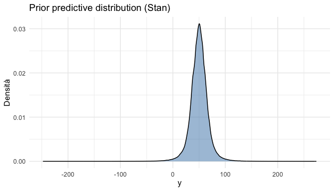 - Valutazione di plausibilità: l’intera distribuzione dei dati simulati \(\{y^{(1)}, \dots, y^{(S)}\}\) viene confrontata con la conoscenza pre-esperimento del fenomeno, inclusi vincoli teorici o empirici (ad esempio, range possibili, ordine di grandezza atteso).
