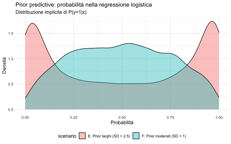 Prior troppo larghi nella regressione logistica equivalgono ad assumere, prima di vedere i dati, che siano probabili risposte quasi deterministiche. Questo è spesso incoerente con la variabilità tipica dei fenomeni psicologici.