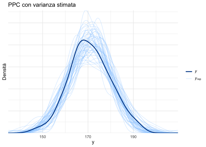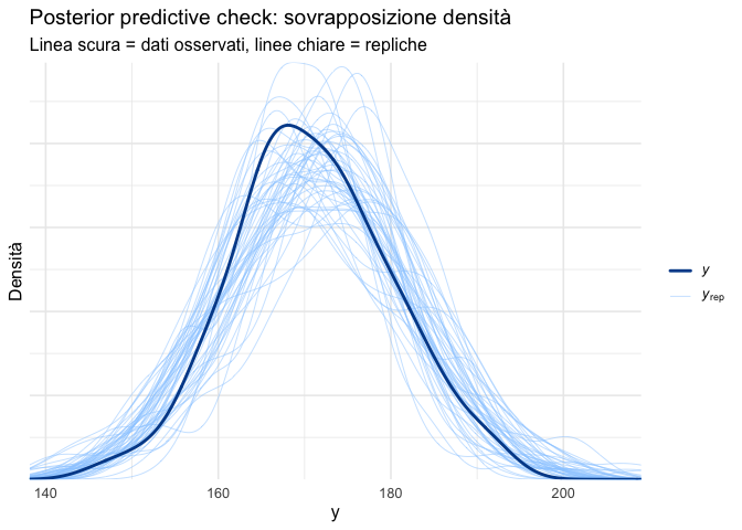 Il confronto visivo più immediato consiste nel sovrapporre la distribuzione empirica dei dati osservati alla distribuzione di un campione di repliche predittive generate dal modello. In questo tipo di grafico: