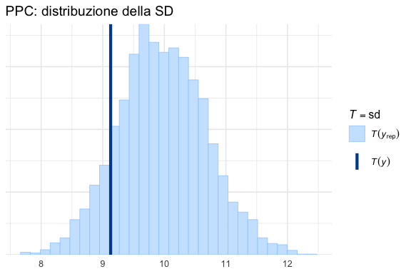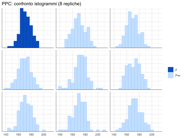 Se il modello è appropriato, l’istogramma dei dati osservati dovrebbe apparire simile nella forma e nella dispersione agli istogrammi delle repliche. Differenze sistematiche (ad esempio, un picco più alto, code più lunghe o una diversa asimmetria nei dati osservati) segnalano potenziali inadeguatezze del modello.