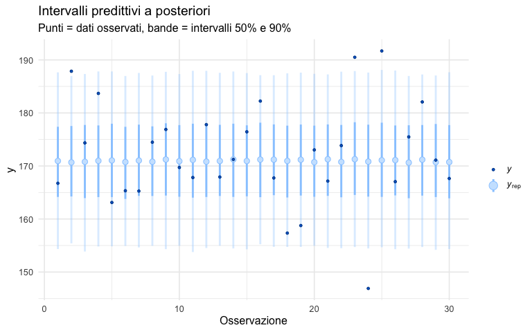 Questo capitolo è dedicato specificamente alla distribuzione predittiva a posteriori, cioè alla generazione di dati simulati dopo aver aggiornato le nostre credenze sui parametri attraverso l’evidenza dei dati osservati. Per un’analisi complementare che valuta la plausibilità dei dati prima di osservarli, incentrata sulla scelta delle distribuzioni a priori, si rimanda alla sezione sui controlli predittivi a priori (Appendice O).