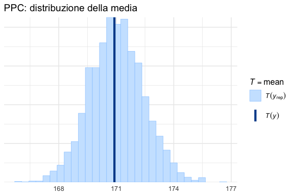 I controlli predittivi a posteriori (Posterior Predictive Checks, PPC) costituiscono un metodo fondamentale per valutare la bontà di adattamento di un modello bayesiano. L’idea è semplice: se un modello rappresenta adeguatamente il processo generativo dei dati osservati, allora dati nuovi, simulati a partire dalla distribuzione a posteriori dei parametri, dovrebbero essere statisticamente simili ai dati osservati.