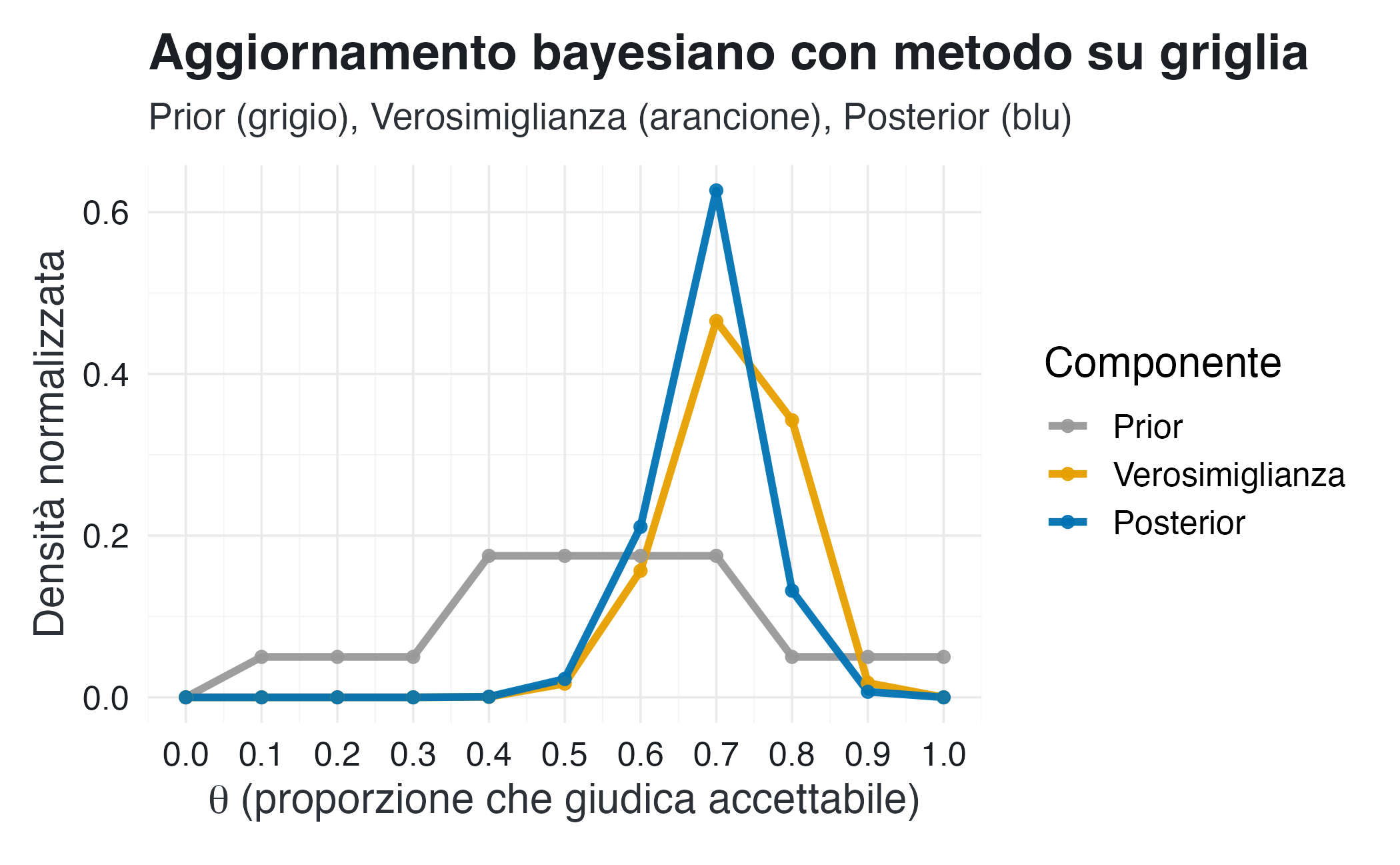 #> [1] 0.0 0.1 0.2 0.3 0.4 0.5 0.6 0.7 0.8 0.9 1.0La griglia risultante contiene undici valori equidistanti. Questa discretizzazione è sufficientemente fine per scopi didattici, mantenendo comunque i calcoli trasparenti e gestibili. In applicazioni reali, potremmo utilizzare griglie molto più fini, con centinaia o migliaia di punti, per approssimare meglio la distribuzione continua sottostante. Tuttavia, per comprendere il meccanismo fondamentale dell’aggiornamento bayesiano, questa griglia grossolana è perfettamente adeguata e ha il vantaggio di rendere ogni calcolo esplicitamente verificabile.