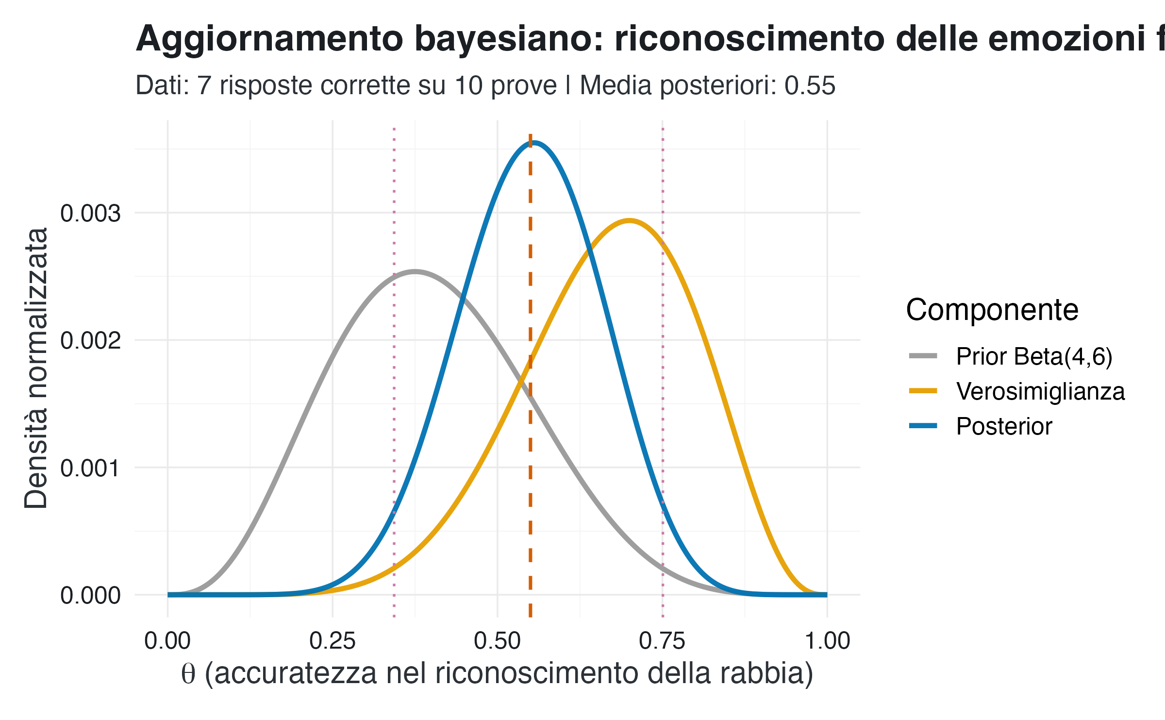 )Il grafico mostra la dinamica dell’aggiornamento bayesiano in questo contesto. Il prior Beta(4,6) è centrato su 0.4 e riflette aspettative moderate, basate sulla letteratura. La verosimiglianza mostra un picco più alto attorno a 0.7, corrispondente alla proporzione di sette risposte corrette su dieci osservate. La distribuzione a posteriori rappresenta un compromesso: è spostata verso destra rispetto al prior, riflettendo l’influenza dei dati, ma non coincide completamente con la verosimiglianza, mantenendo l’influenza regolarizzante del prior.