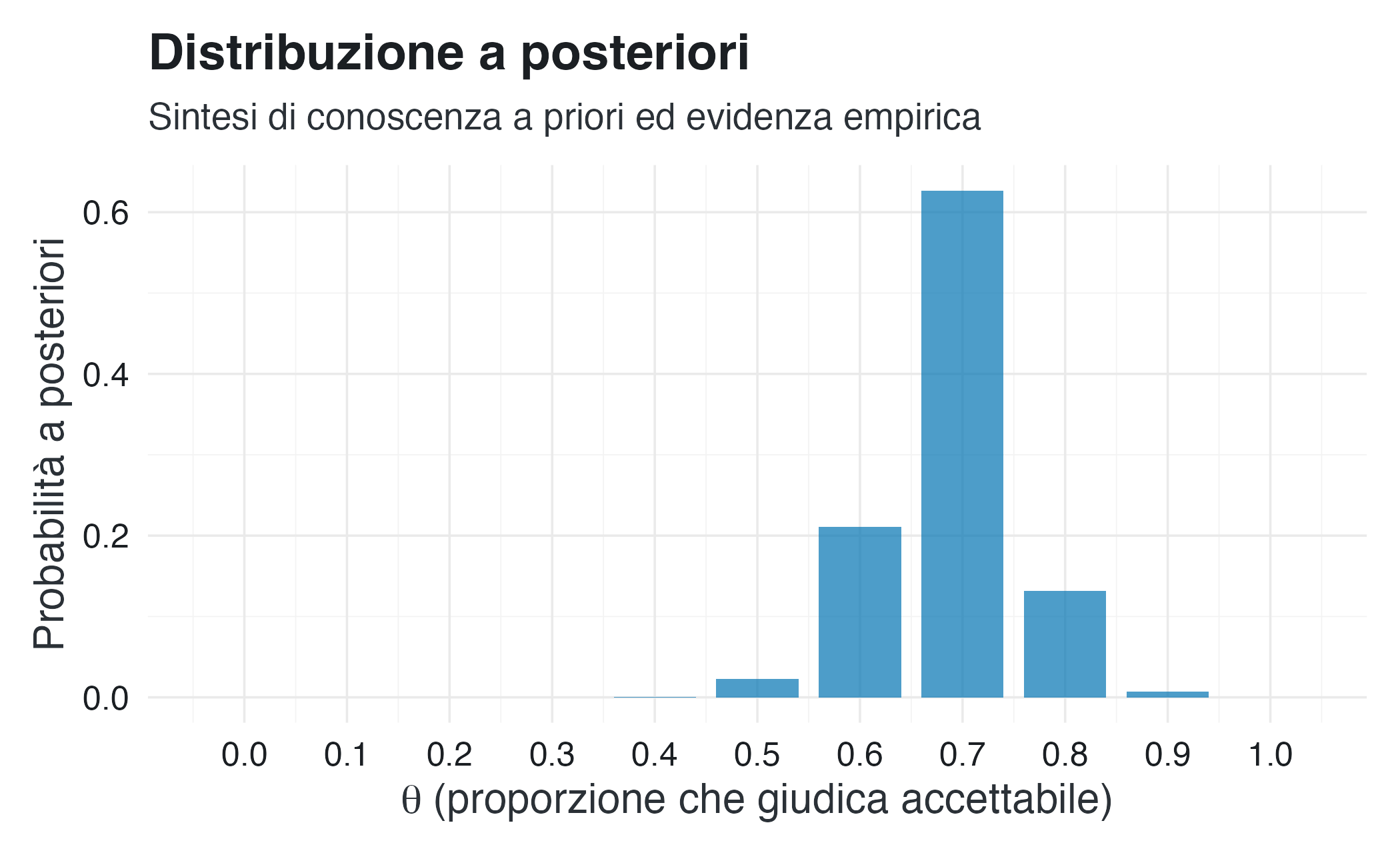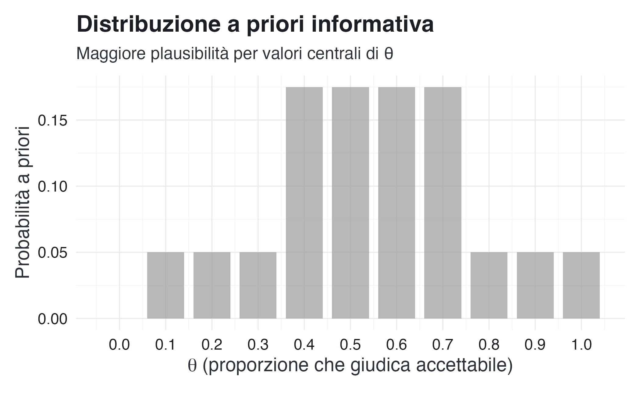 somma_prior <- sum(prior_informativo)La somma delle probabilità nel nostro prior è 1, il che conferma che abbiamo specificato una distribuzione di probabilità valida. Questa distribuzione assegna una probabilità pari a zero agli estremi, ovvero ai valori di \(\theta\) pari a 0 e a 1, riflettendo la convinzione che sia improbabile che nessuno o tutti accettino l’azione nel dilemma. I valori centrali, compresi tra 0.4 e 0.7, ricevono le probabilità più alte, riflettendo l’aspettativa che le opinioni morali siano distribuite in modo relativamente equilibrato all’interno della popolazione.