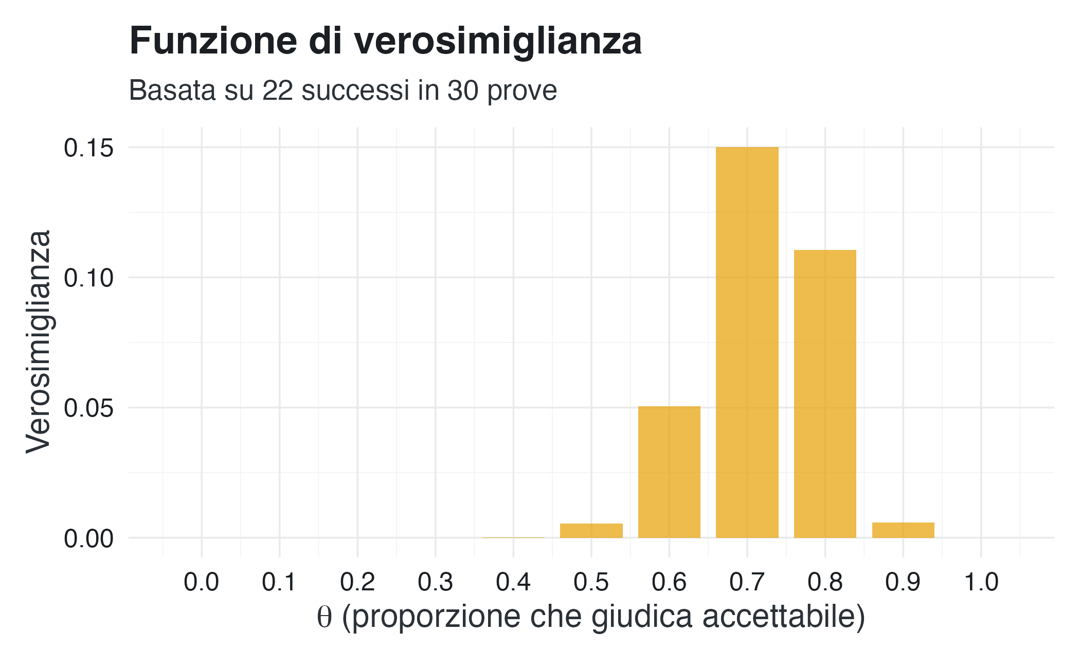 La verosimiglianza quantifica quanto i dati osservati siano compatibili con ciascun possibile valore del parametro. Nel nostro caso, abbiamo osservato ventidue risposte positive su trenta partecipanti. Per ogni valore di \(\theta\) nella griglia, calcoliamo la probabilità di ottenere questo risultato (\(y\) = 22; \(n\) = 30) se quel valore specifico fosse il parametro reale della popolazione.