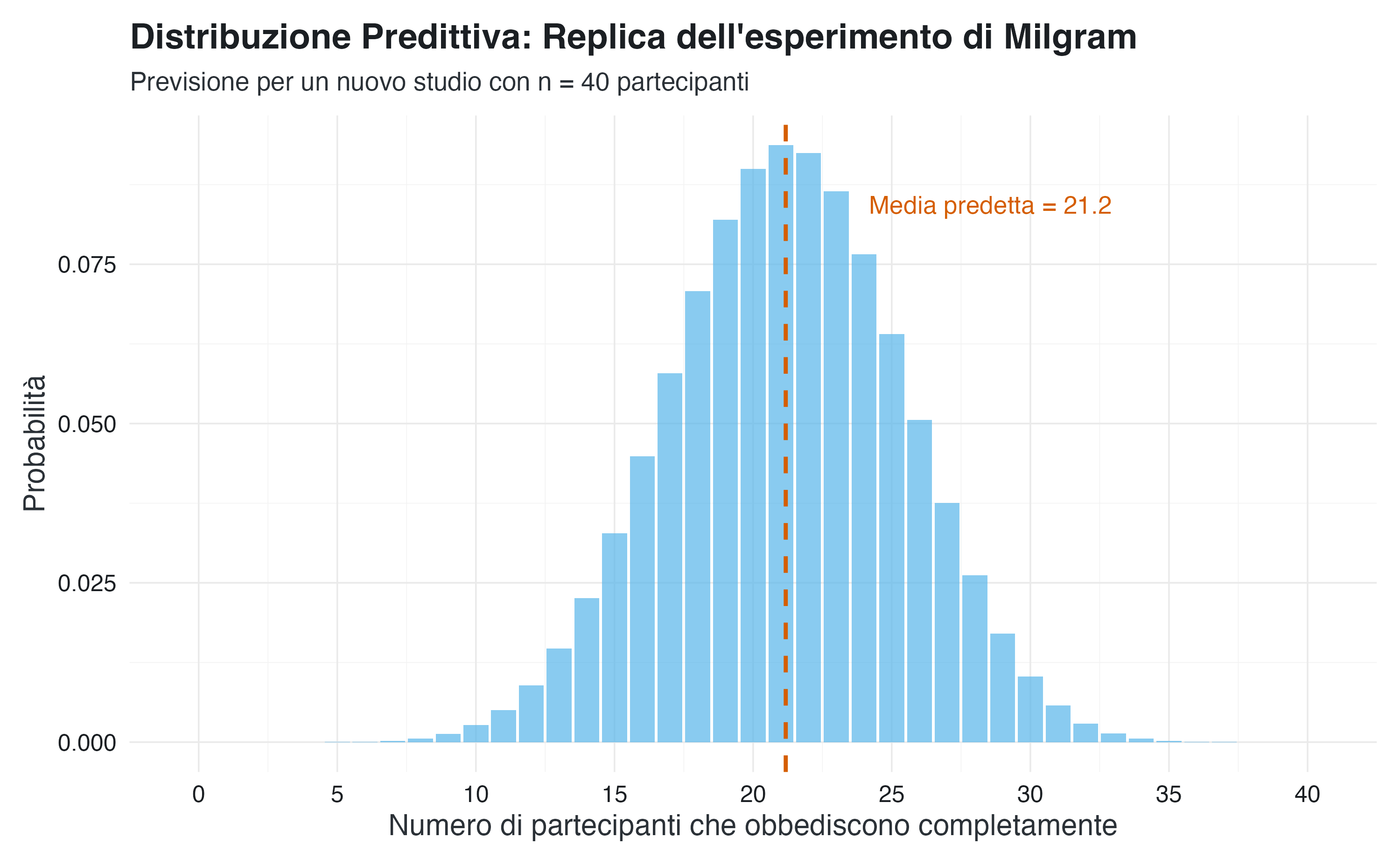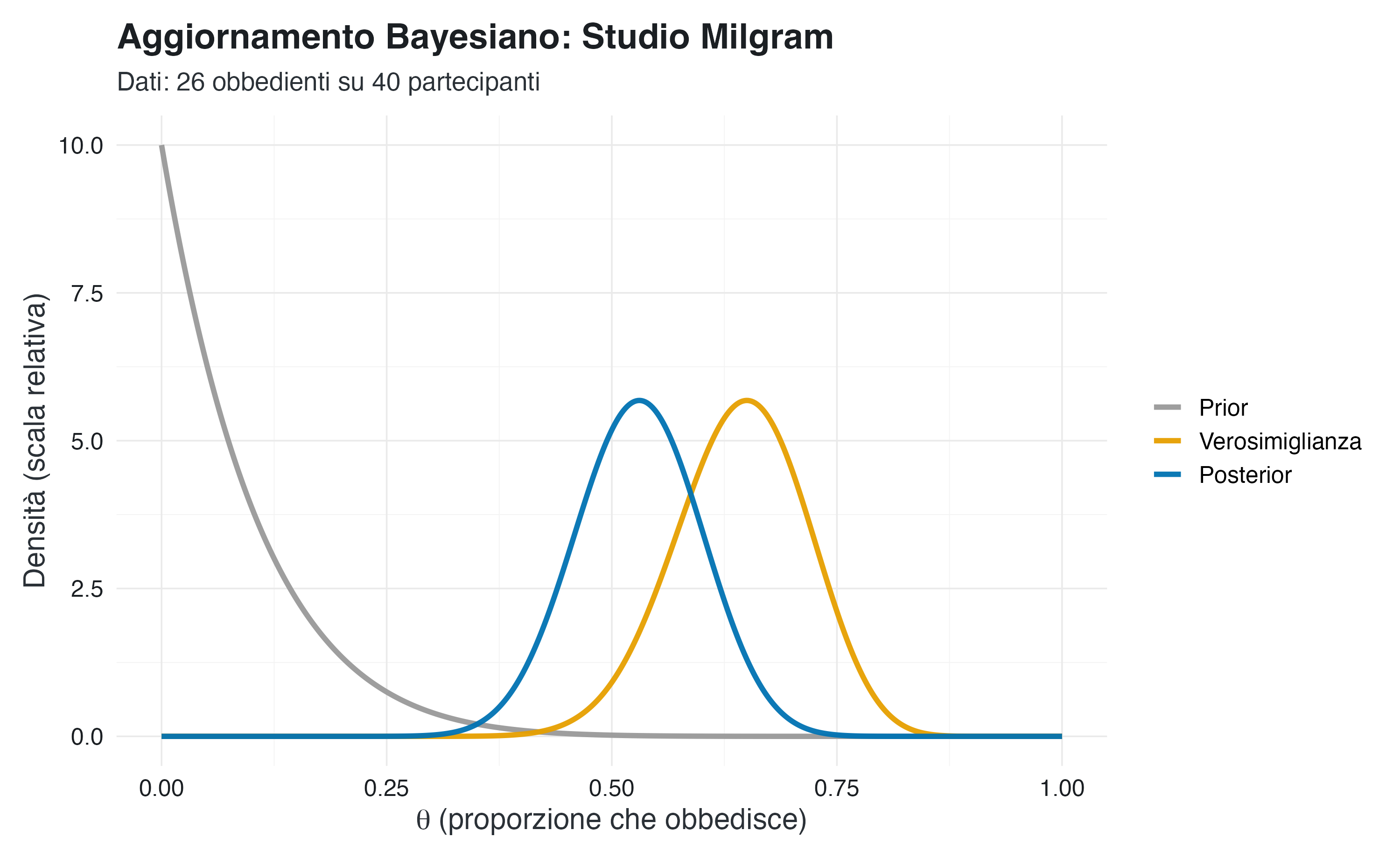 Da un punto di vista statistico, ci si può chiedere quale sia la proporzione della popolazione generale che, in condizioni sperimentali simili, mostrerebbe un livello analogo di obbedienza. L’inferenza bayesiana consente di quantificare l’incertezza associata a questa stima e di valutare esplicitamente come i dati modifichino le credenze iniziali.