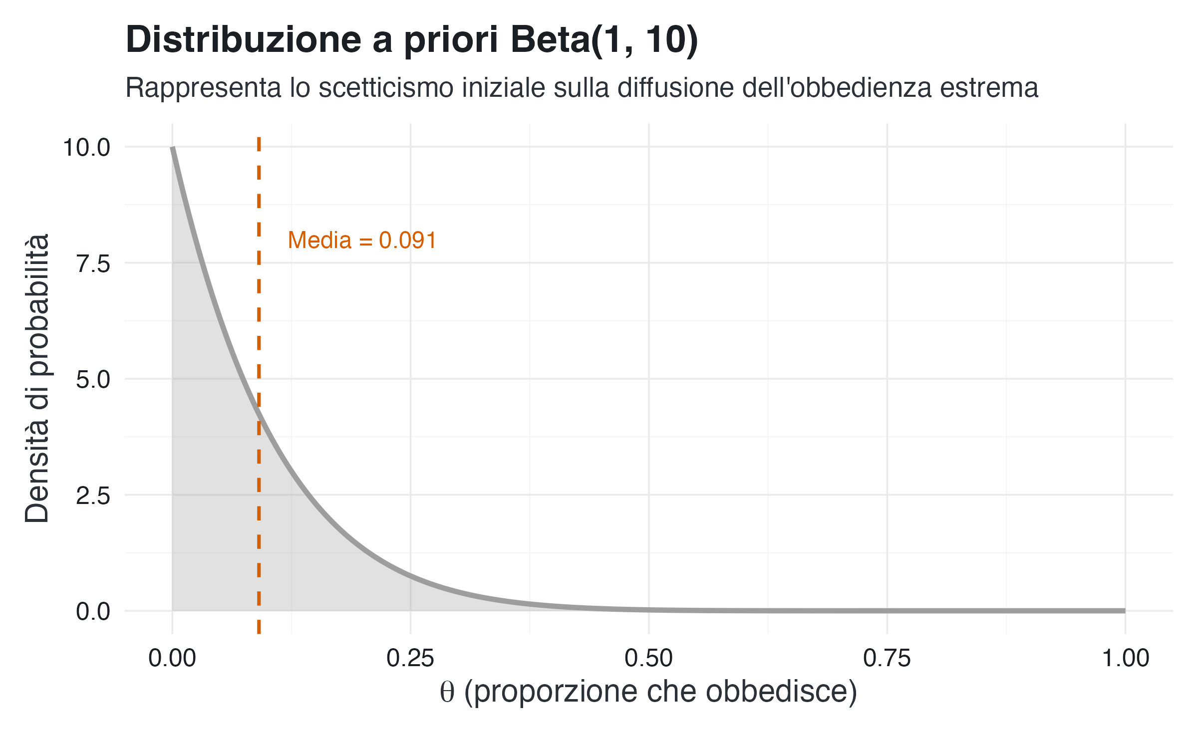 Prima di esaminare i dati, specifichiamo una distribuzione a priori che esprima scetticismo riguardo alla diffusione dell’obbedienza estrema. Adottiamo una distribuzione Beta(1,10).