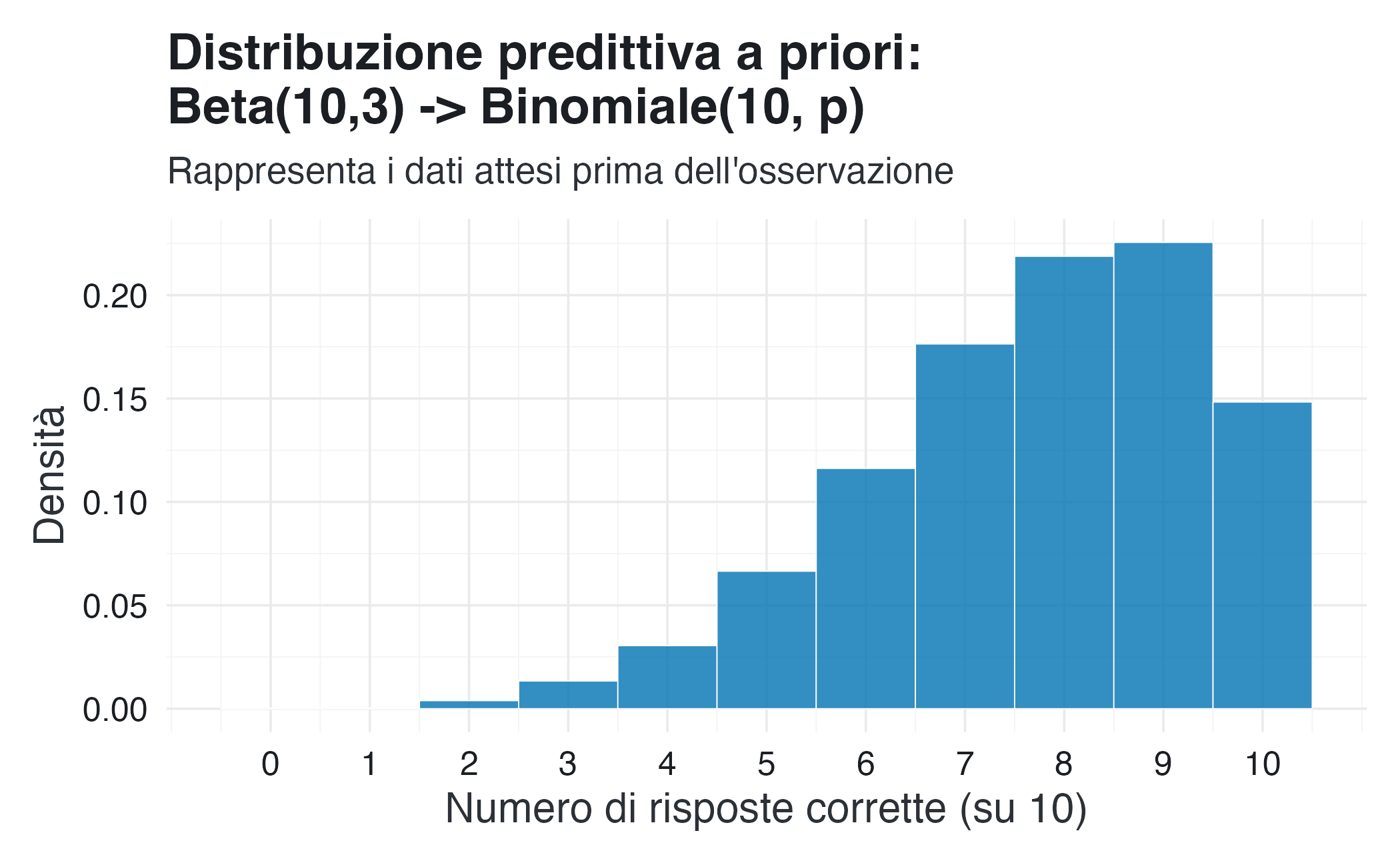- Distribuzione predittiva a priori: massa distribuita su tutti i possibili risultati da 0 a 10.