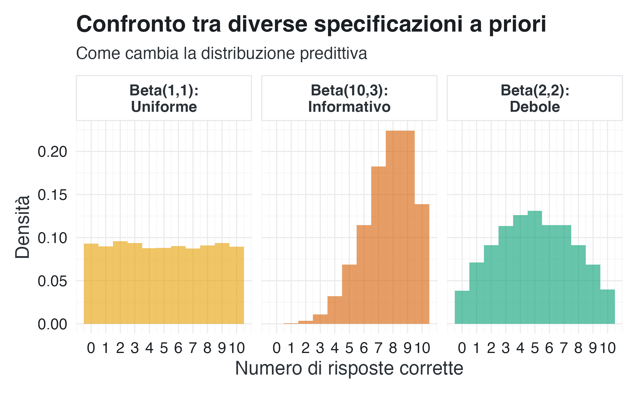 - Prior informativo → distribuzione predittiva a priori concentrata sugli esiti coerenti con la nostra conoscenza preliminare.