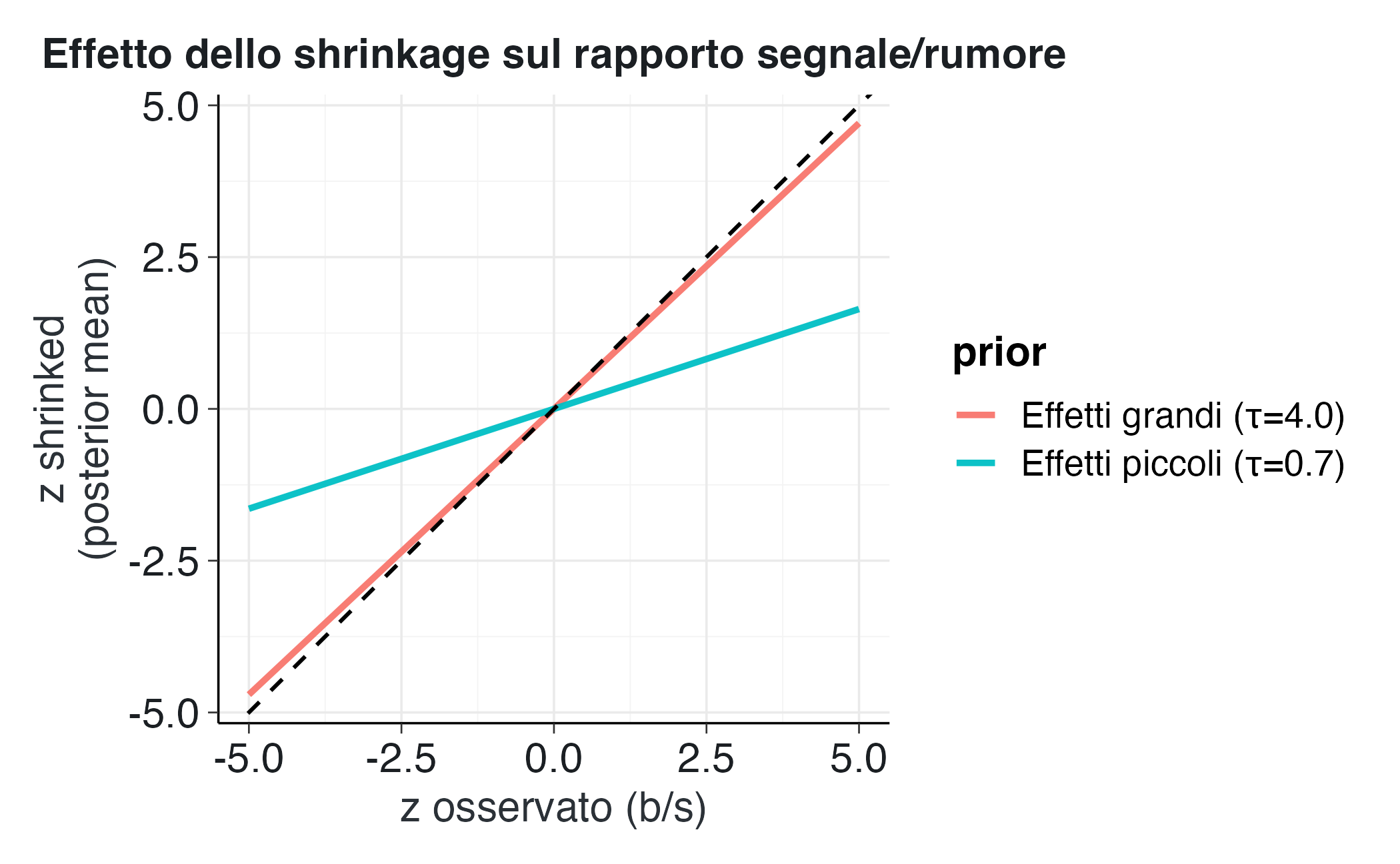Questa stabilizzazione funziona davvero quando la prior è scelta sulla *scala giusta*. Se stimiamo un coefficiente $\beta$ con errore standard $s$, la quantità informativa non è $\beta$ in sé, ma il rapporto adimensionale $\xi=\beta/s$, che misura il segnale in unità di rumore. Lavorare su $\xi$ ha tre conseguenze pratiche: rende l’analisi *invariante* a cambiamenti di unità di misura, consente il confronto *coerente* tra studi diversi, e fa emergere in modo trasparente *l'influenza* della prior sulla posterior. Quando il rapporto segnale/rumore osservato $z=b/s$ è piccolo, la prior esercita una contrazione benefica verso valori plausibili; quando invece $|z|$ è grande, invece, è la verosimiglianza a dominare e l'influenza della prior si riduce.