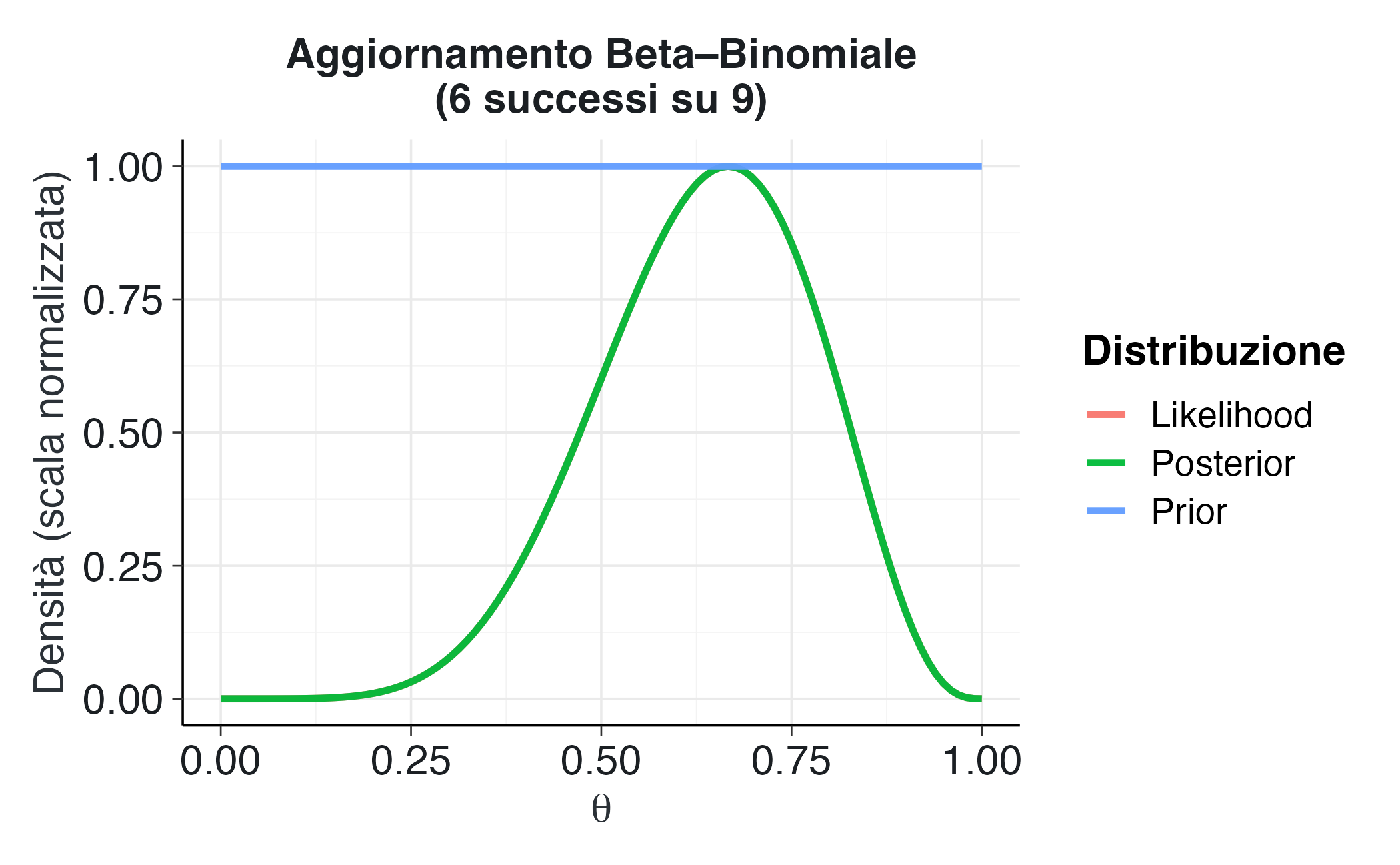 title = "Aggiornamento Beta–Binomiale\n(6 successi su 9)",