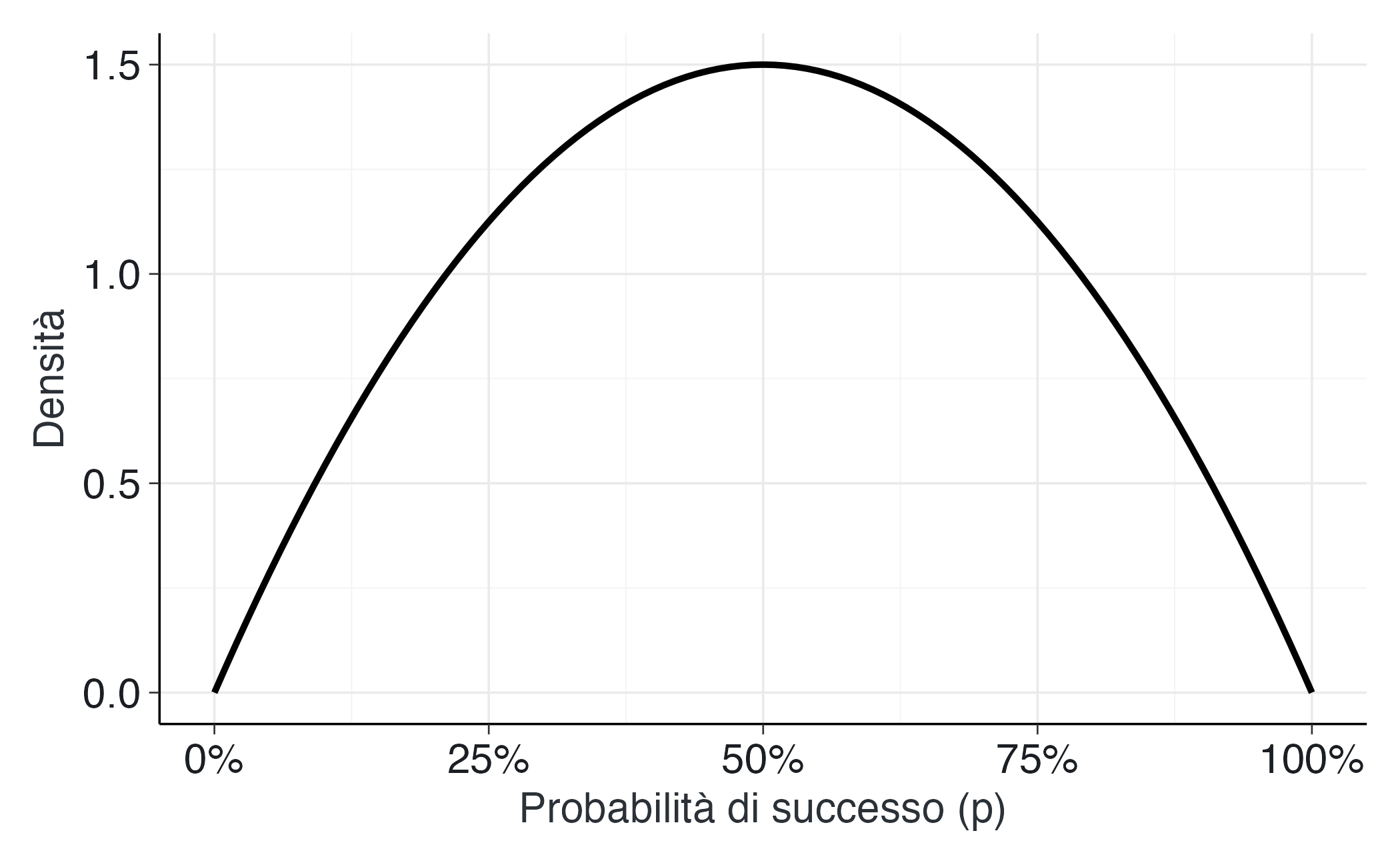 Specifica una distribuzione Beta(a, b) come prior per la probabilità di successo \(p\). Scegli una coppia \((a, b)\) relativamente poco informativa, ad esempio (2,2) o (1,1).