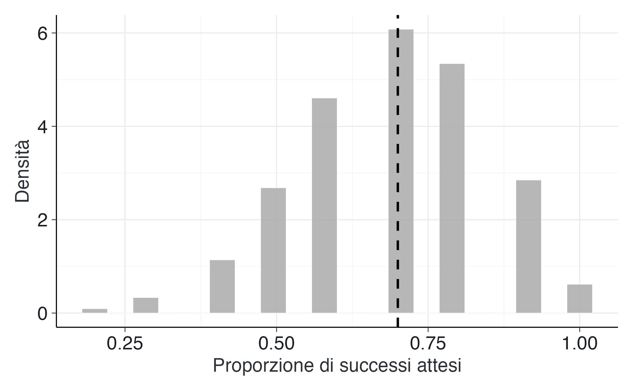 - Esempio: anche supponendo di conoscere con precisione il valore di \(\theta = 0.7\), uno studente potrebbe ottenere 6, 7 o 8 risposte corrette su 10 a causa della variabilità campionaria intrinseca.