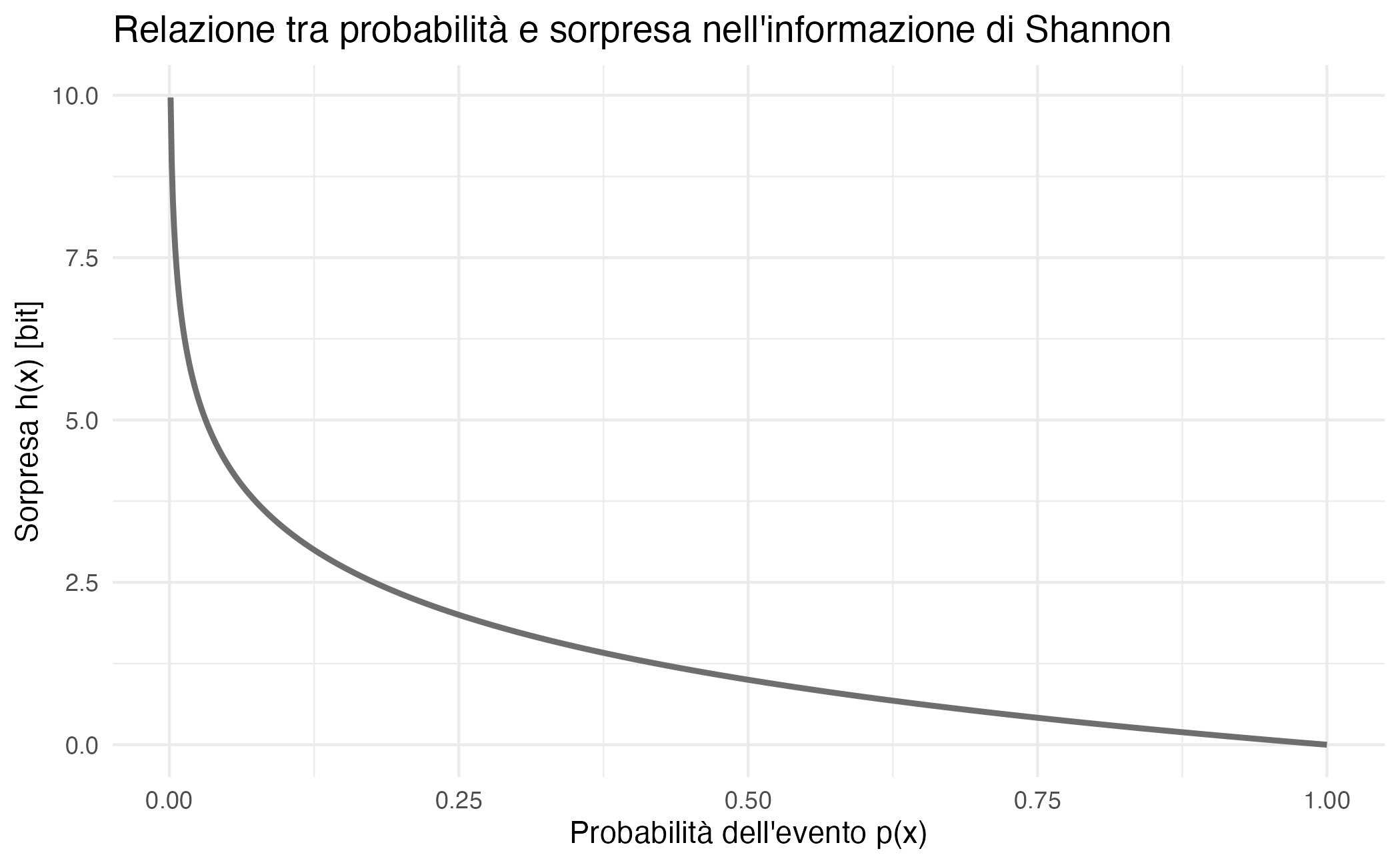 Questi valori mostrano come l’osservazione di un evento raro comporti un “salto informativo” molto più ampio rispetto all’osservazione di un evento comune. In termini predittivi, un evento improbabile induce una revisione più marcata delle nostre aspettative, mentre un evento frequente conferma in larga misura ciò che già ci attendevamo.