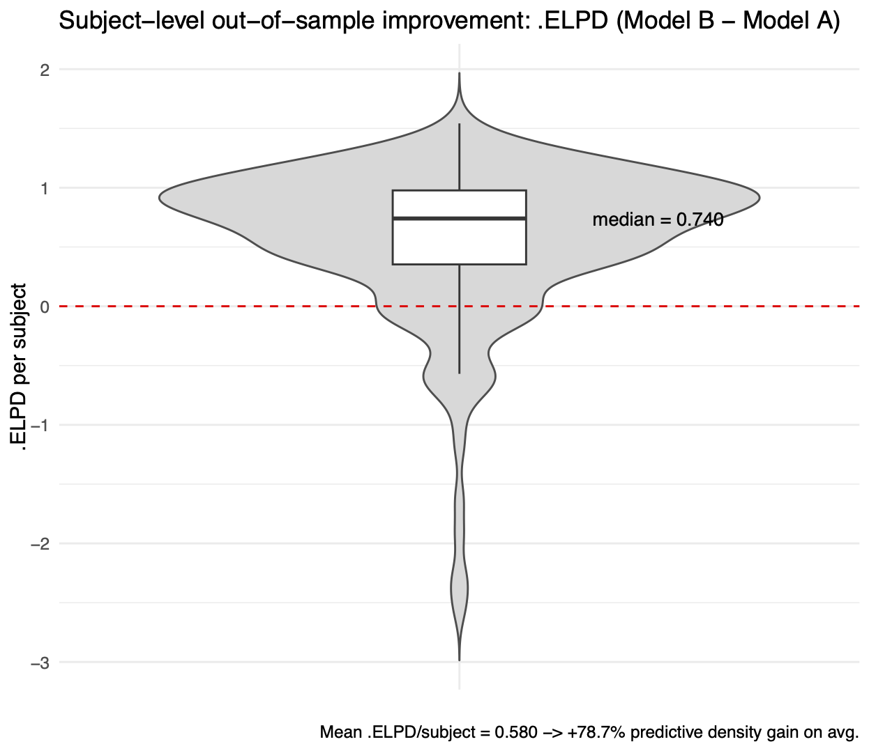 La distribuzione di questi ΔELPD a livello individuale è mostrata nella Figura 2.